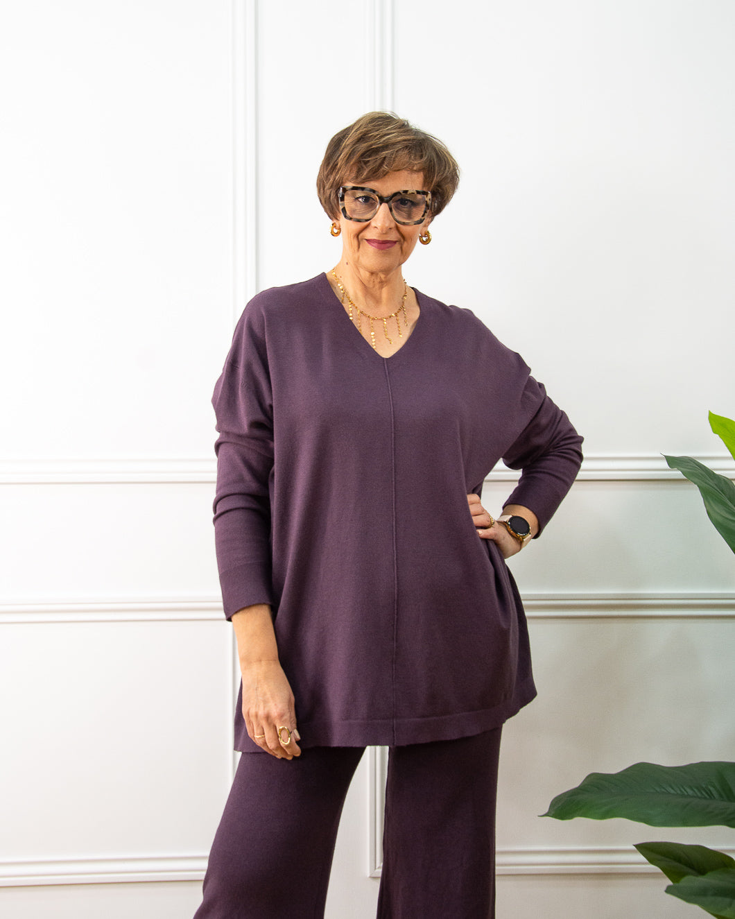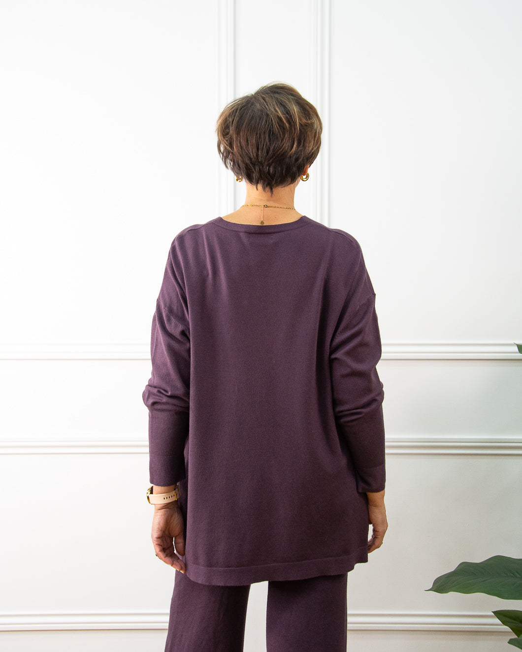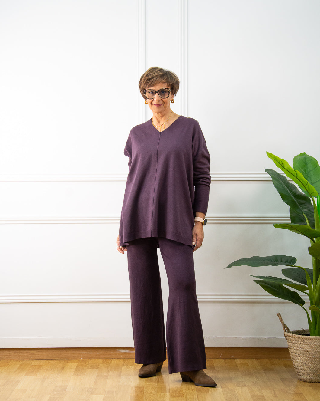 Jersey muy suave, cuello pico alto, lleva un dibujo en puños y bajo al tono. Ideal como básico fondo de armario.