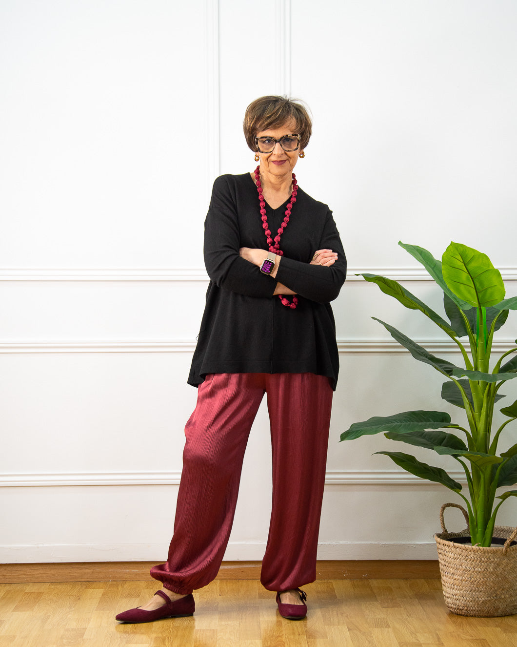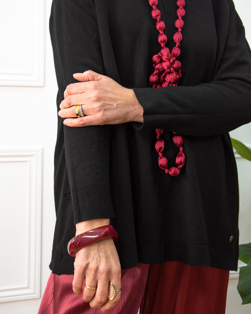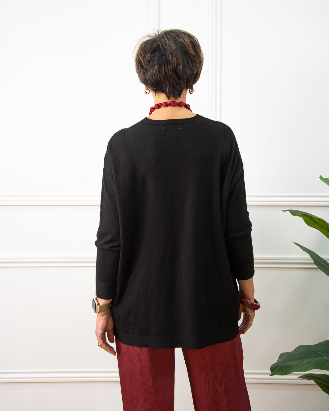 Jersey muy suave, cuello pico alto, lleva un dibujo en puños y bajo al tono. Ideal como básico fondo de armario.