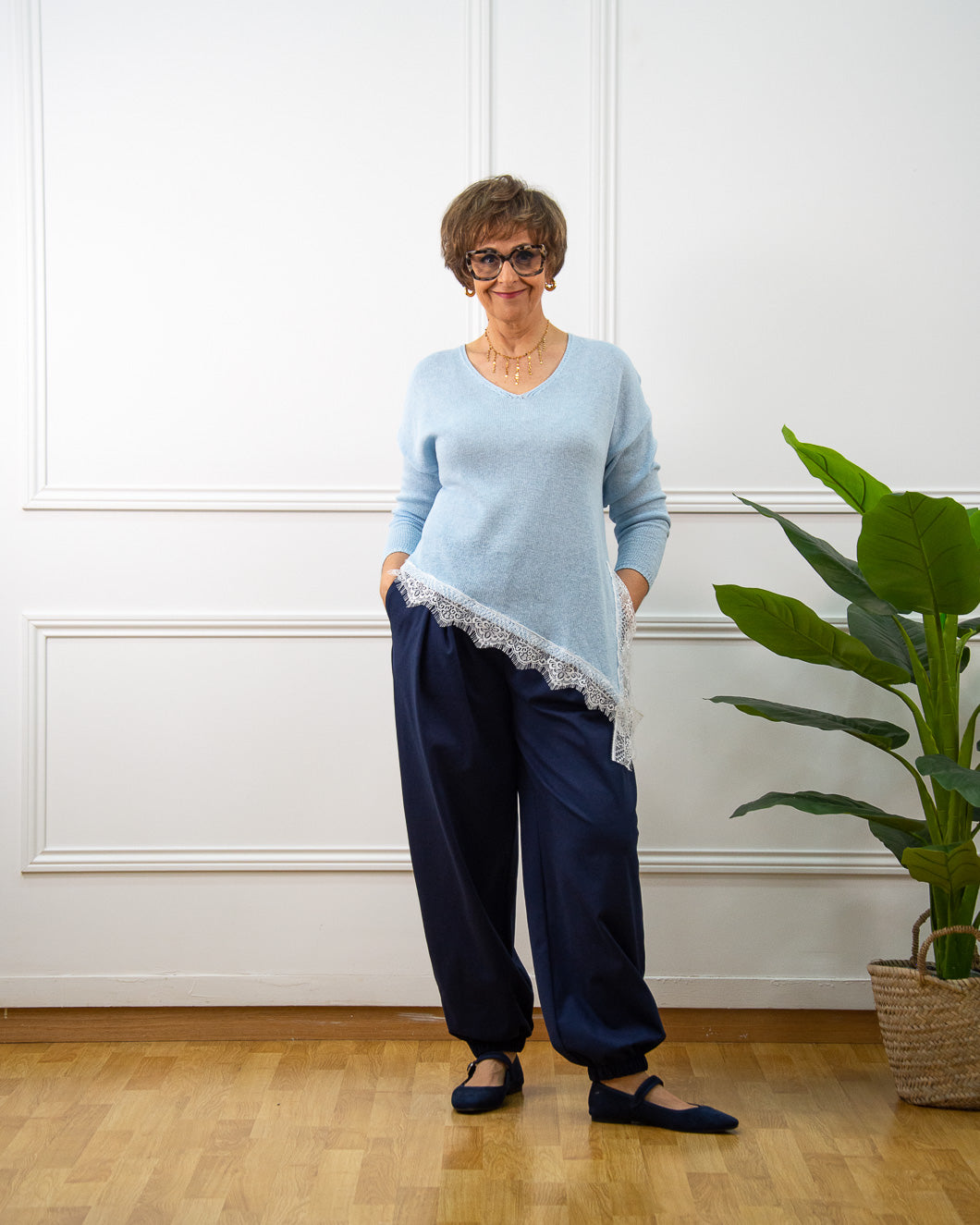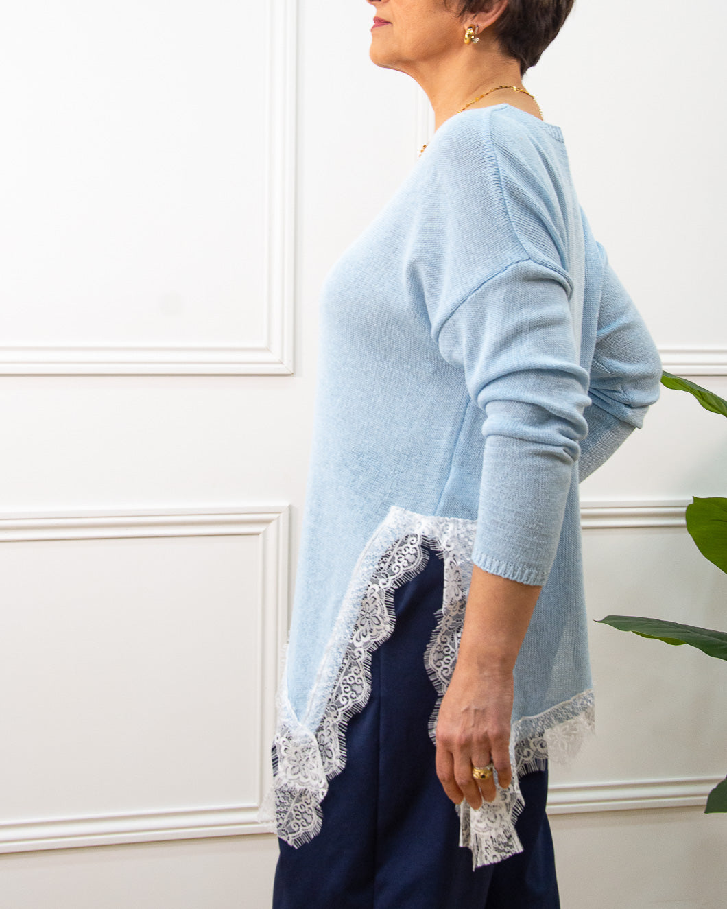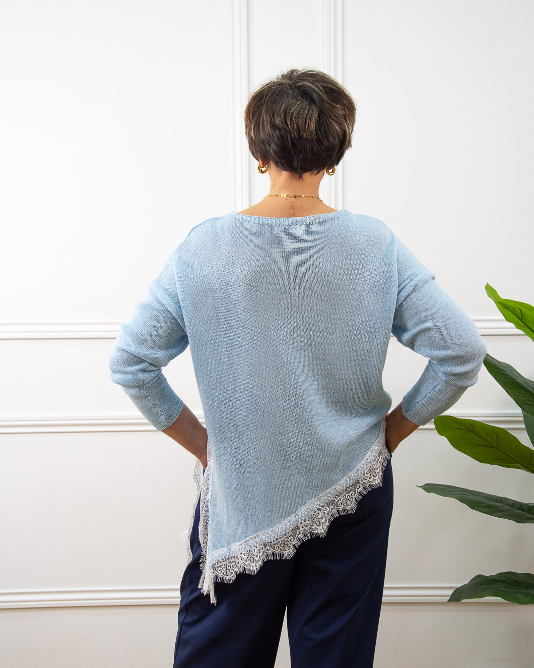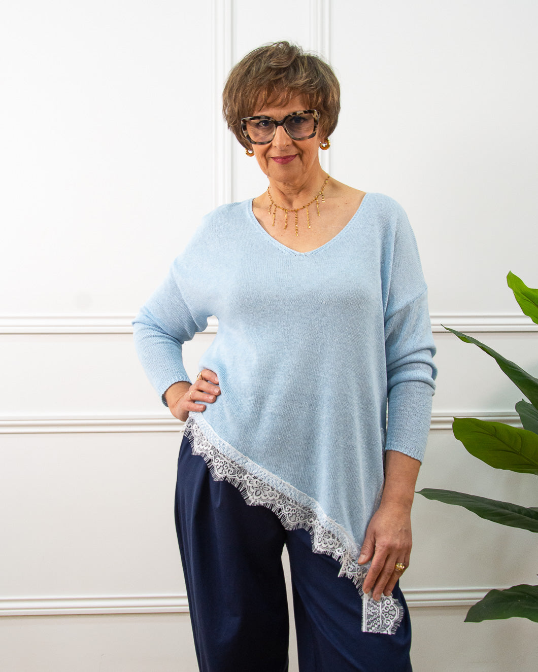 Jersey de perlé de algodón, cuello de pico , tiene forma asimétrica con adorno de encaje súper tendencia, va abierto por el lateral más largo consiguiendo mucho movimiento.