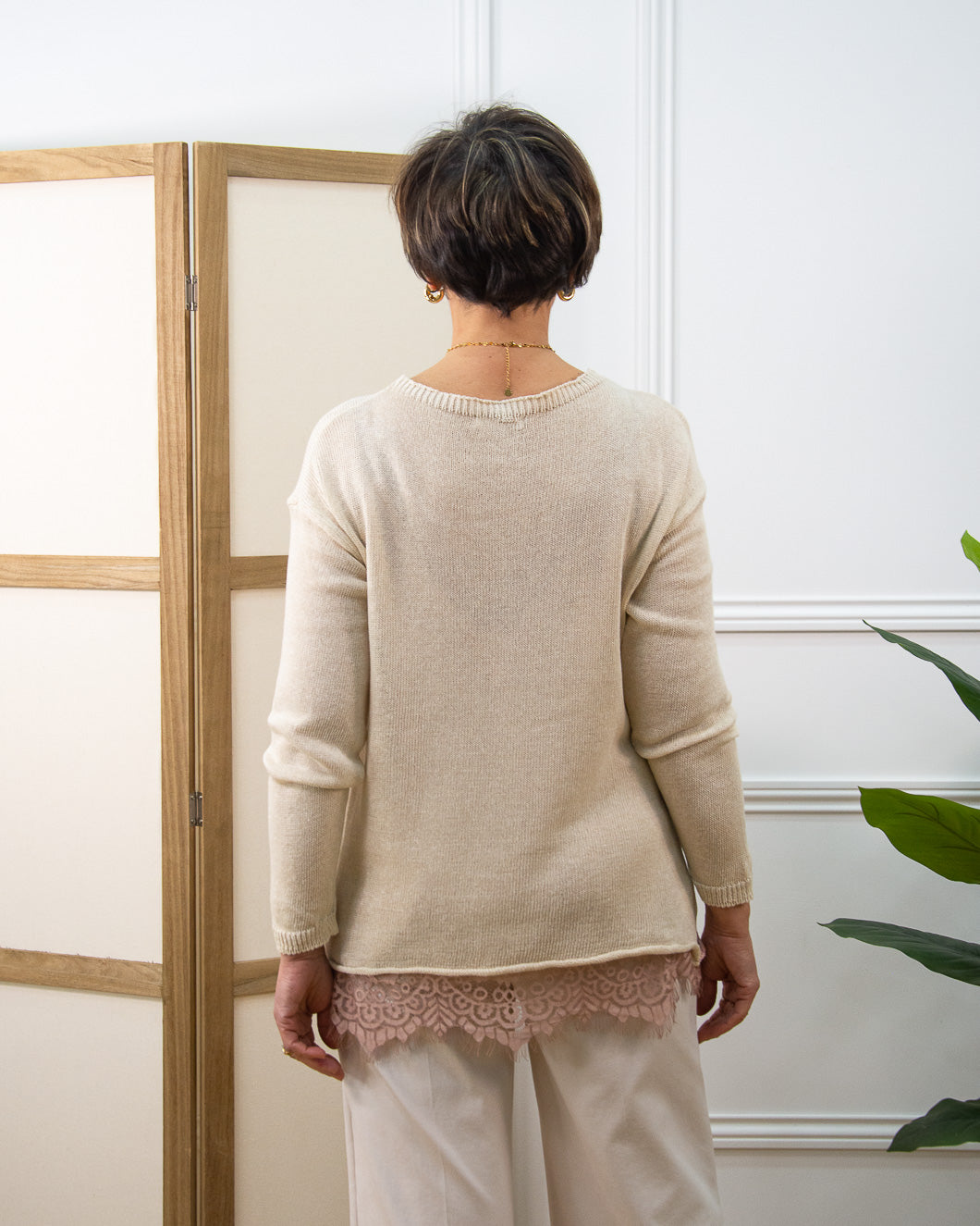 Jersey de perlé de algodón, cuello a la caja, manga larga, lleva tricotada una estrella por delante haciendo la forma del jersey muy original. Muy suave, queda ideal para combinar con la lencera blonda rosa o verde.