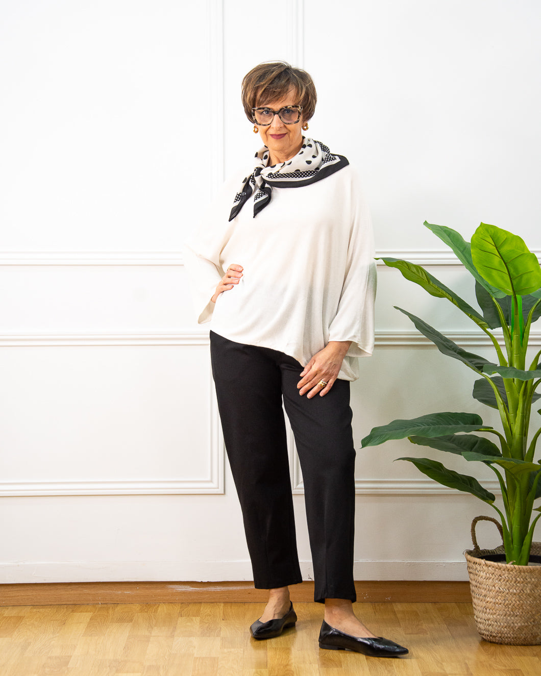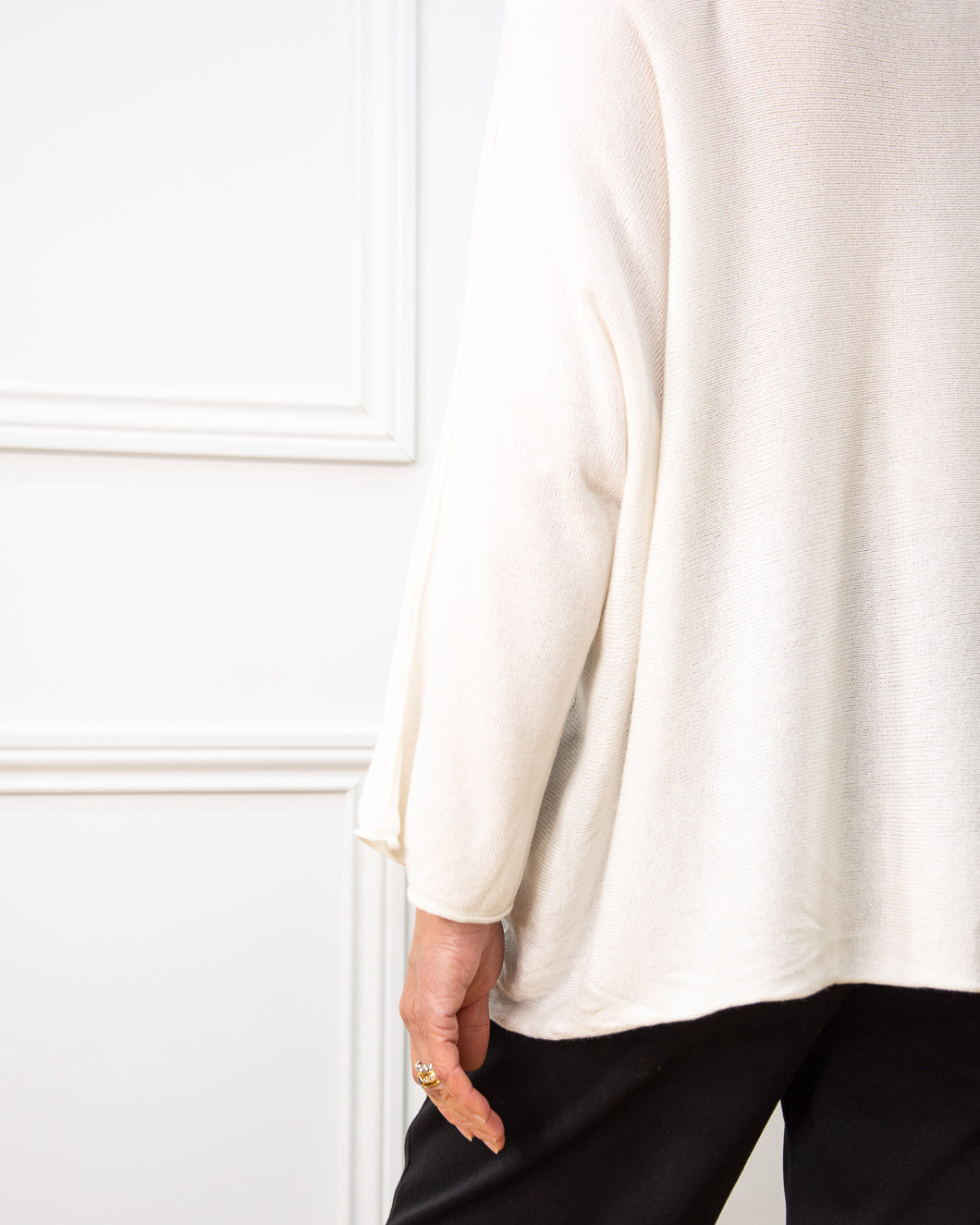 Jersey over size, sin costuras, ultra suave, manga francesa y escote a la caja, ideal para llevar encima de blusas o lenceras.