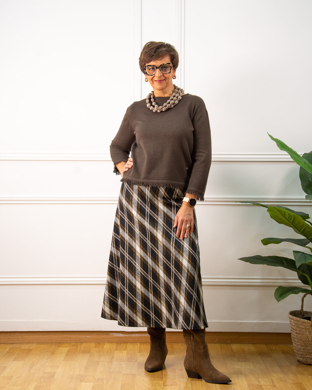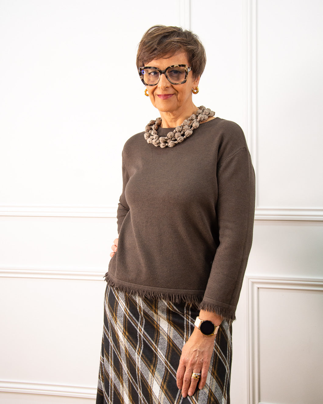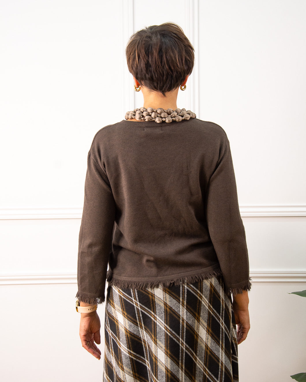 Jersey de cuello redondo, manga francesa, lleva un adorno de mini flecos en la bajo y en los puños, ideal para combinar con falda.