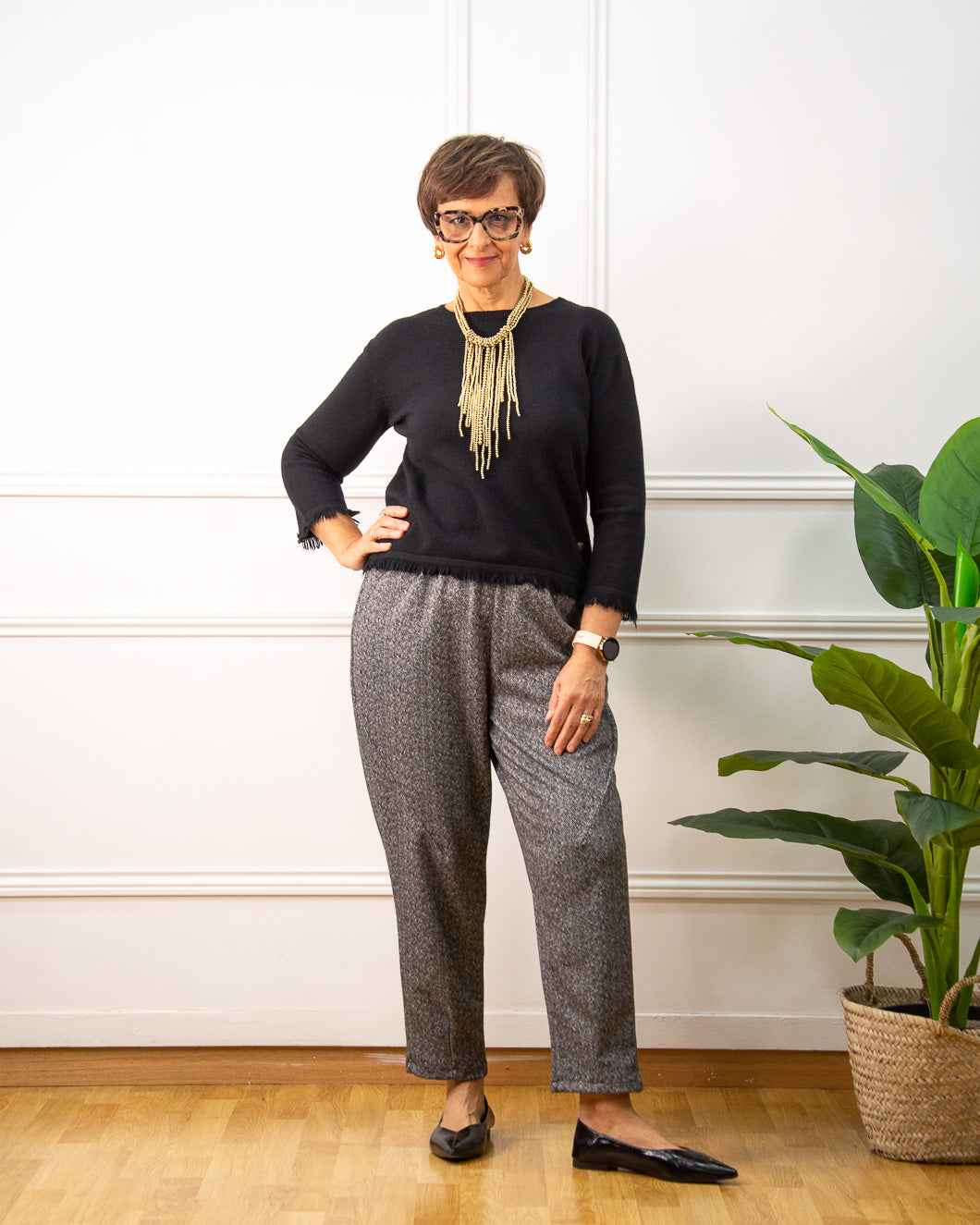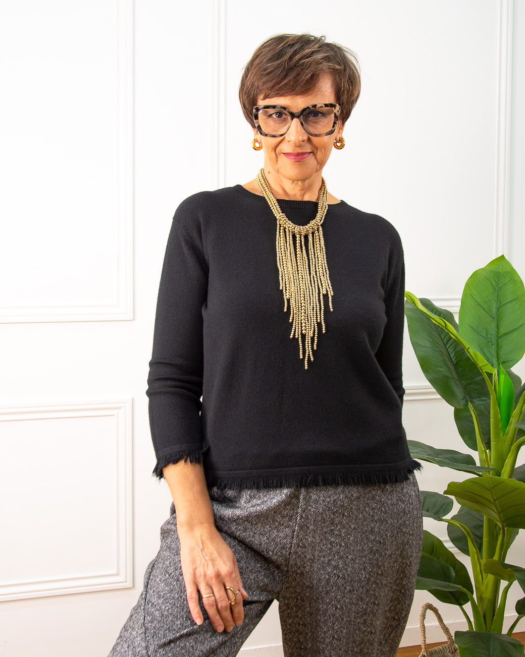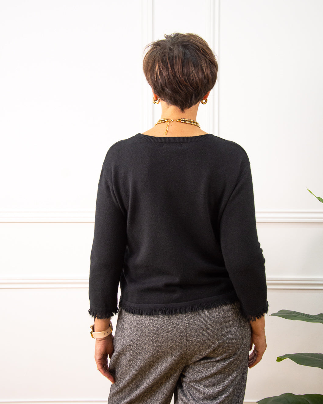 Jersey de cuello redondo, manga francesa, lleva un adorno de mini flecos en la bajo y en los puños, ideal para combinar con falda.