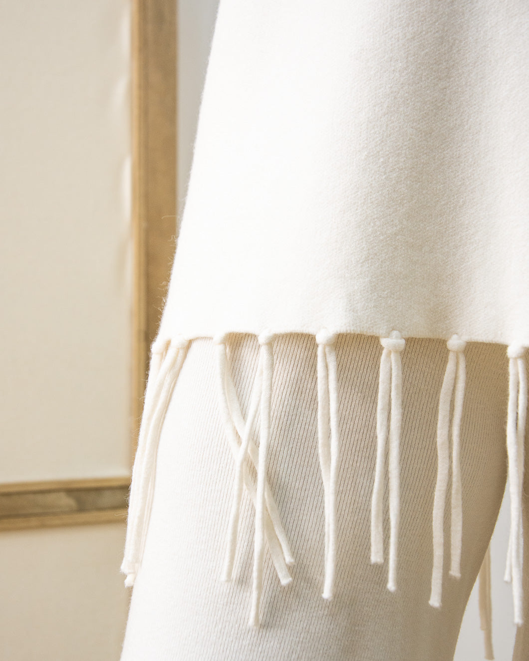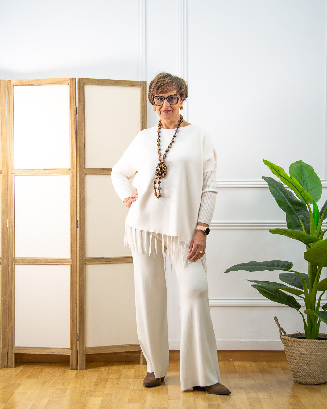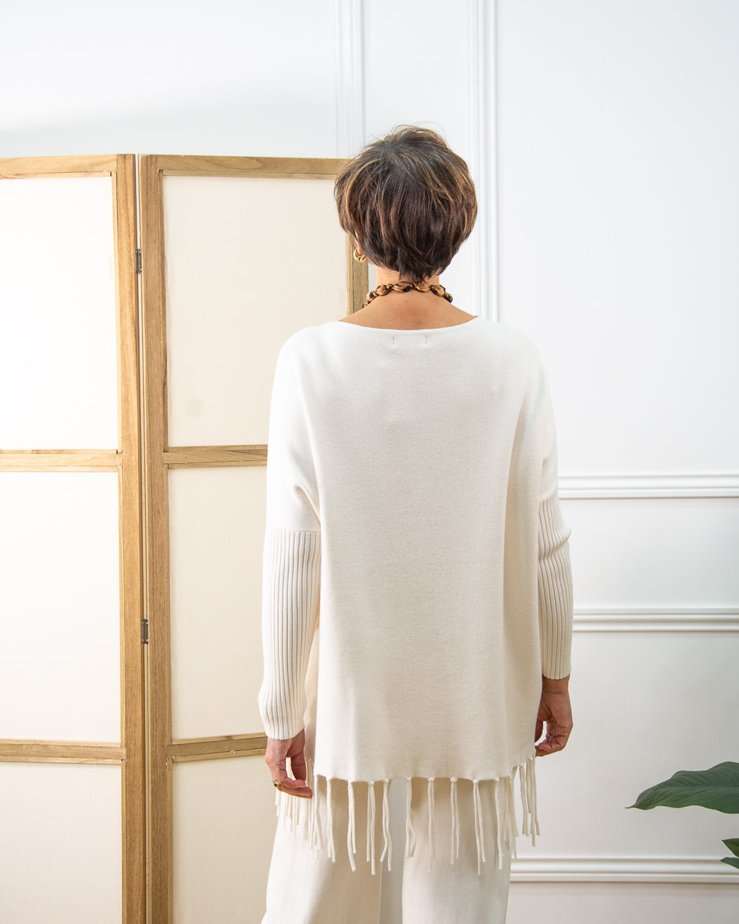 Jersey de doble punto, muy abrigadito, cuello caja , manga caída de canalé, lleva flecos en la parte inferior de 10cm. Combina con pantalón Cloe.