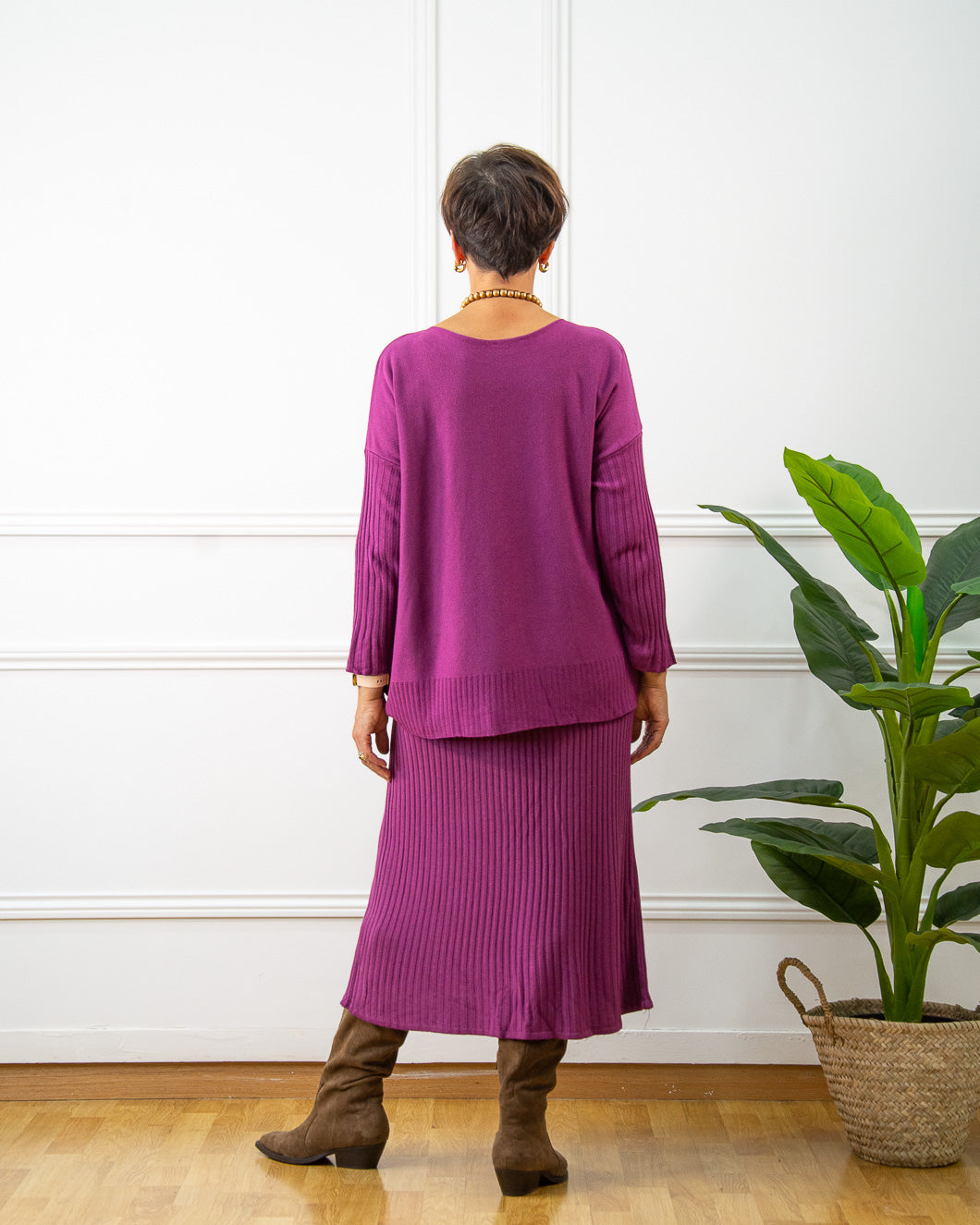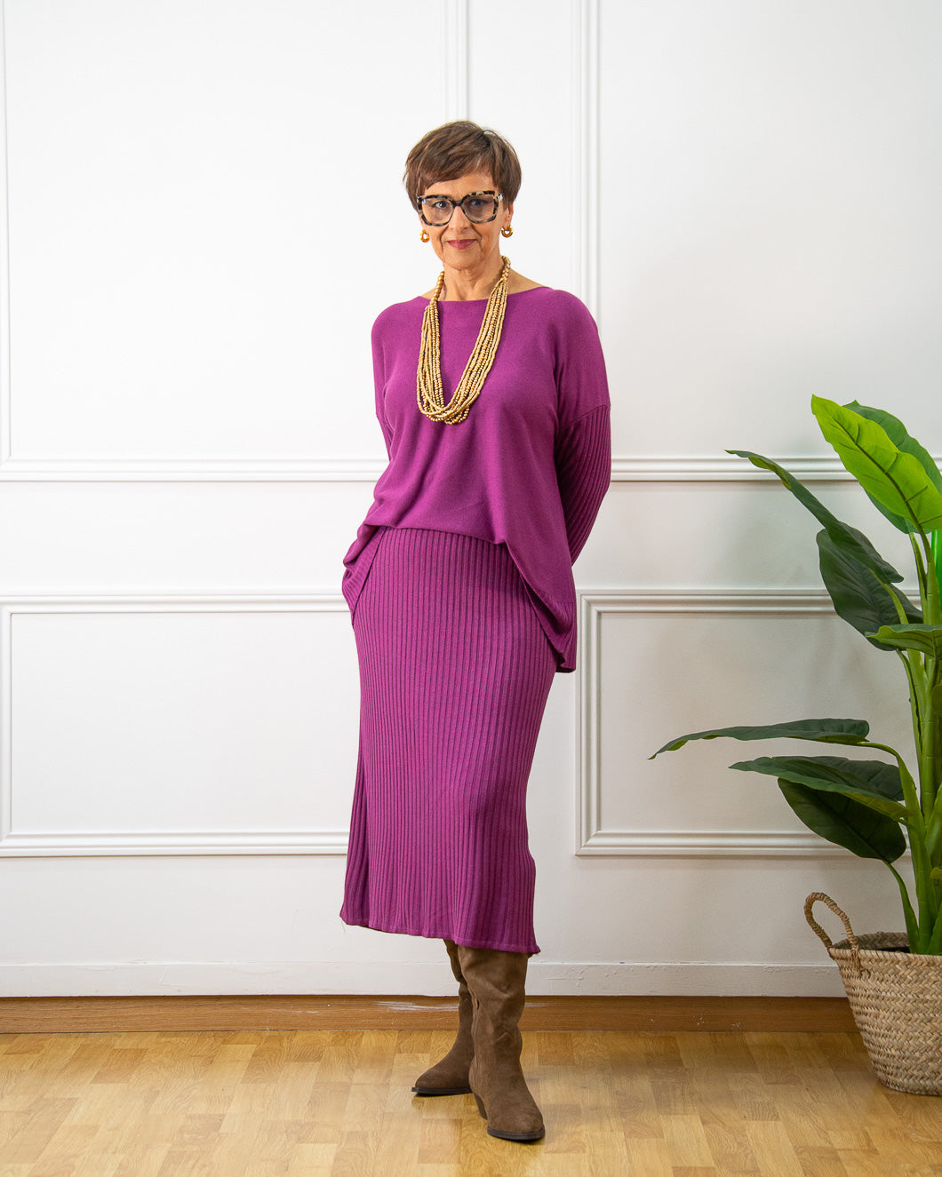 Jersey oversize, cuello barco, manga caída de canalé, no llega hasta la muñeca, lleva un elástico de canalé en la parte de abajo , tiene muchísima caída y no se queda pegado. Disponible en cuatro colores, azul jean, rojo, buganvilla y arena.