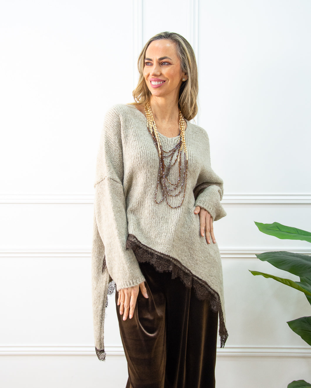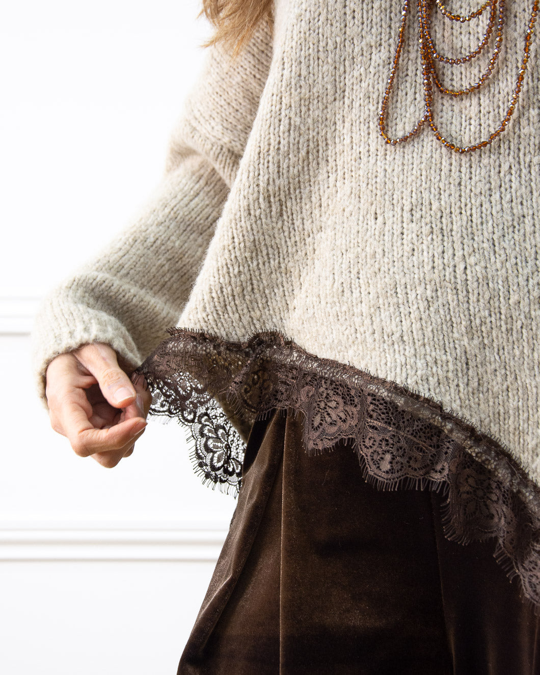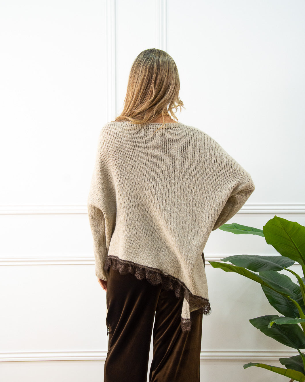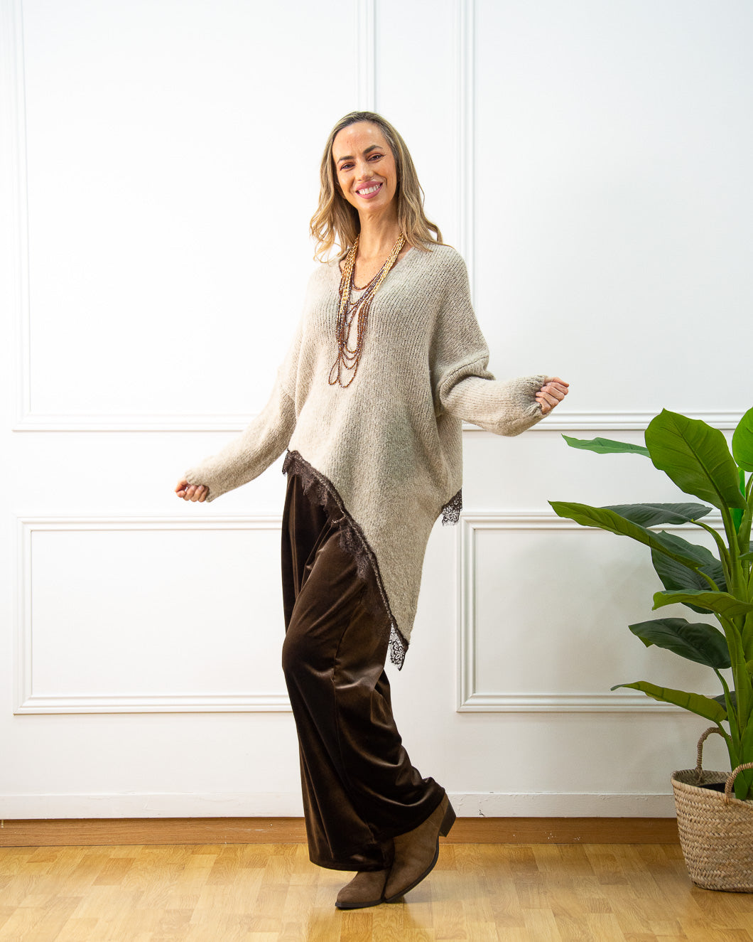 Jersey súper tendencia, termina en dos picos laterales con adorno de encaje marrón. Es muy suave al tacto, ideal para llevar con pantalón terciopelo marrón.