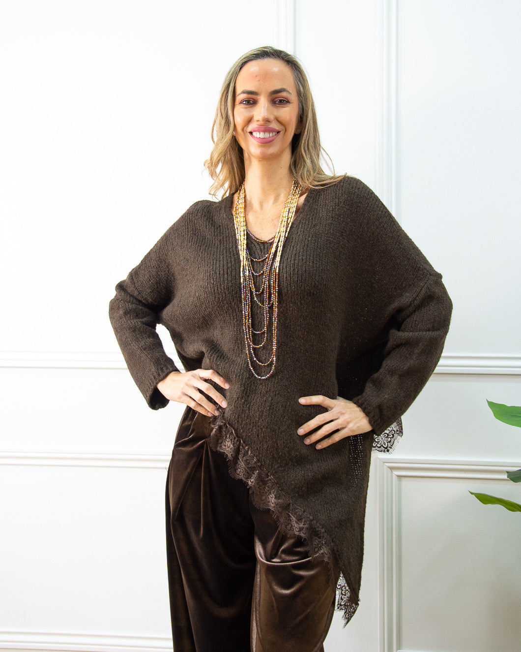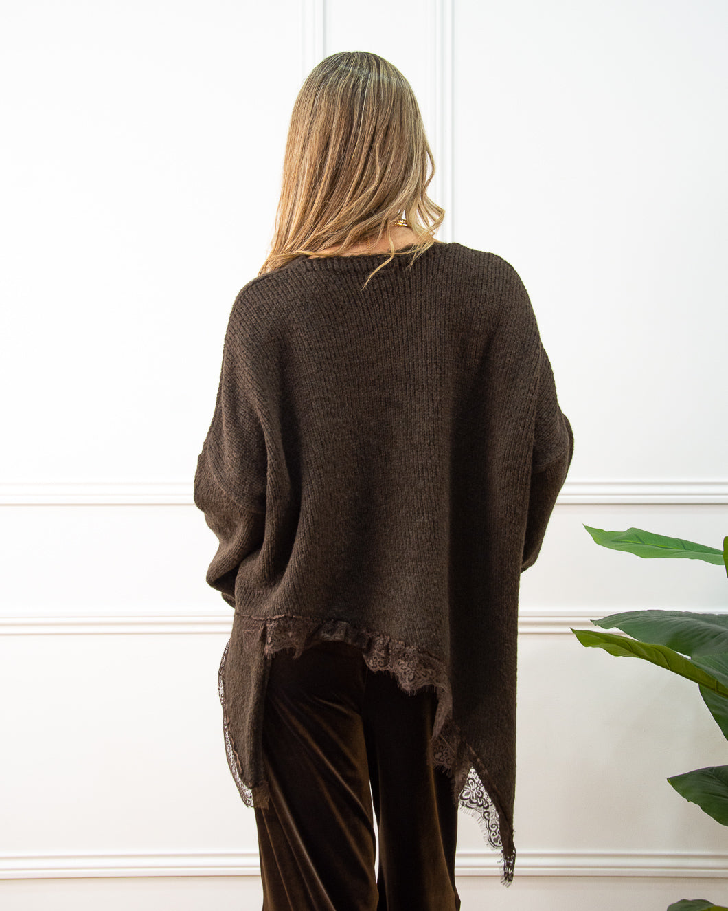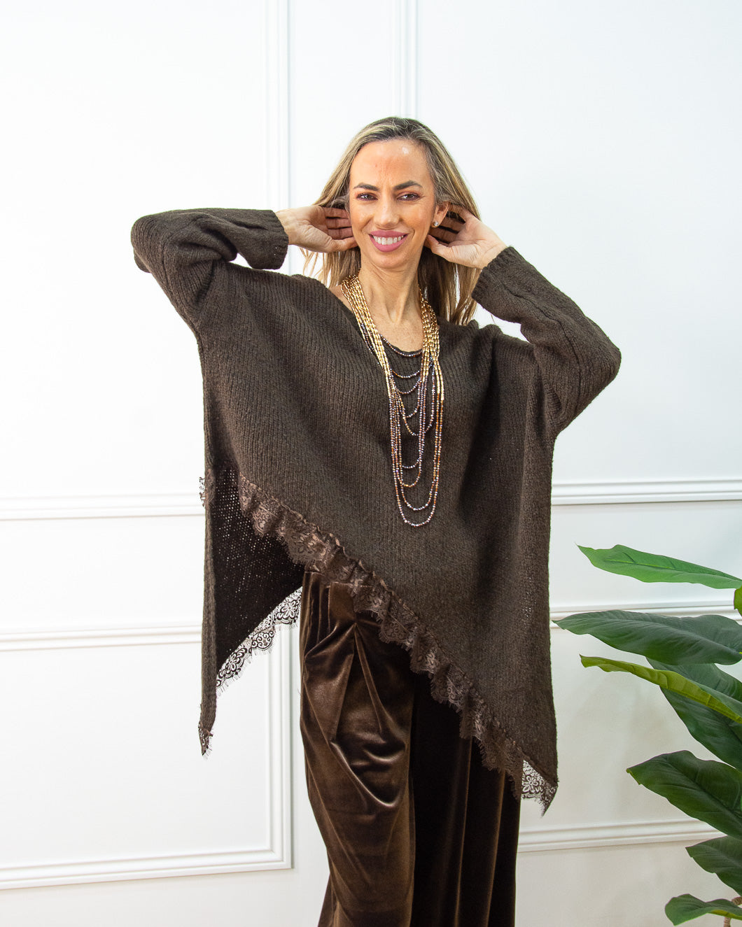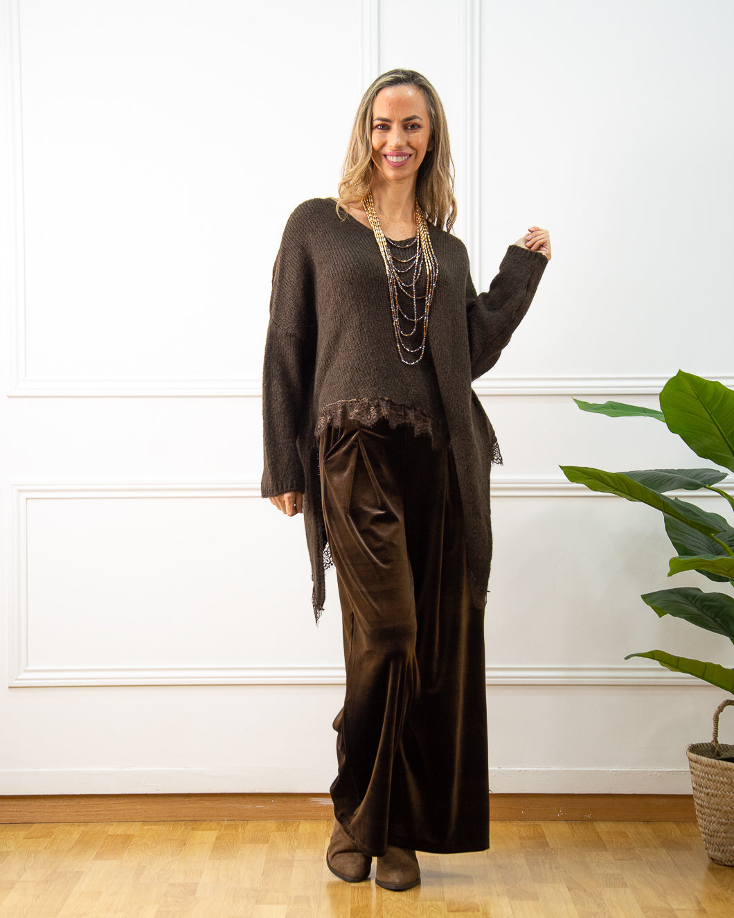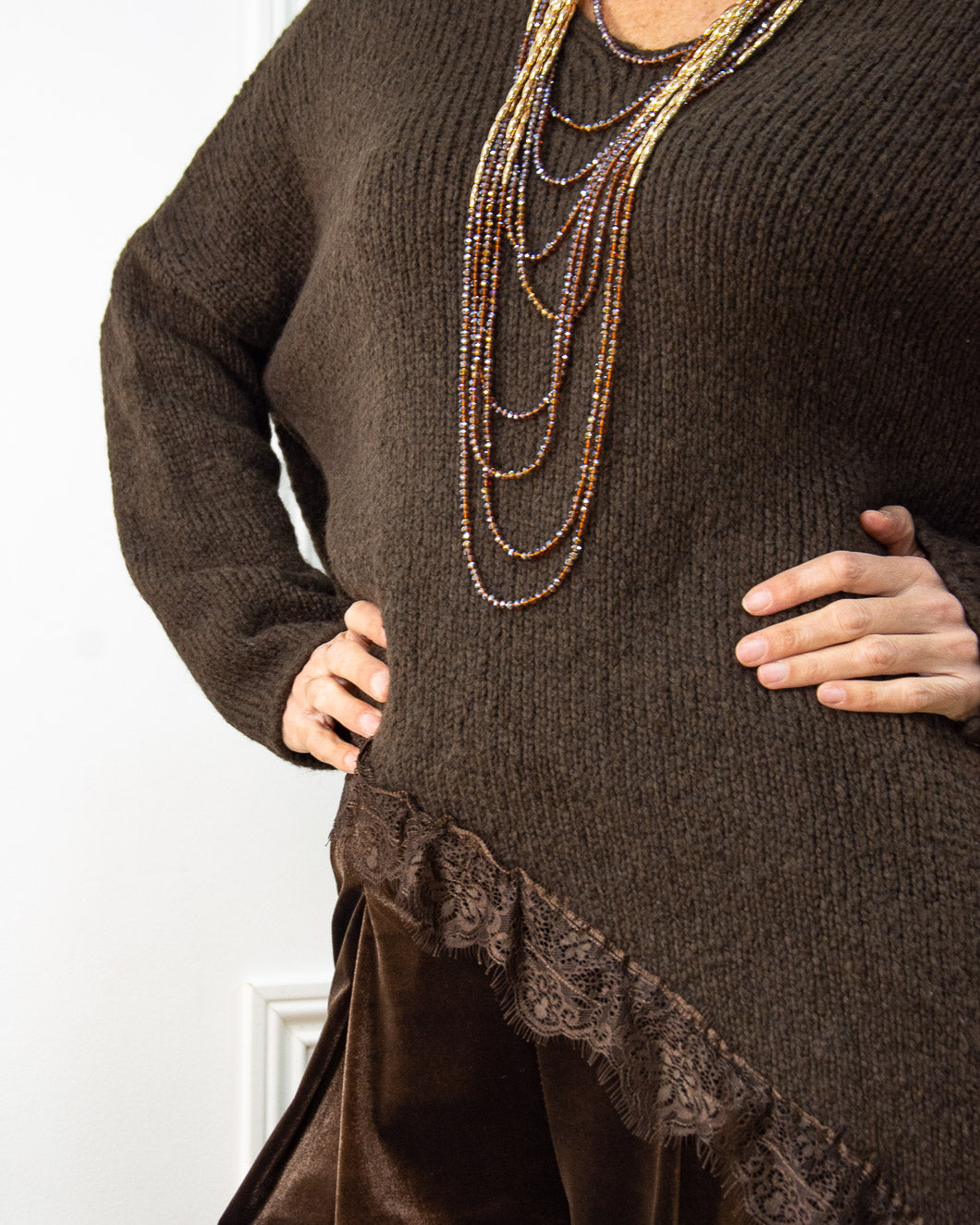 Jersey súper tendencia, termina en dos picos laterales con adorno de encaje marrón. Es muy suave al tacto, ideal para llevar con pantalón terciopelo marrón.