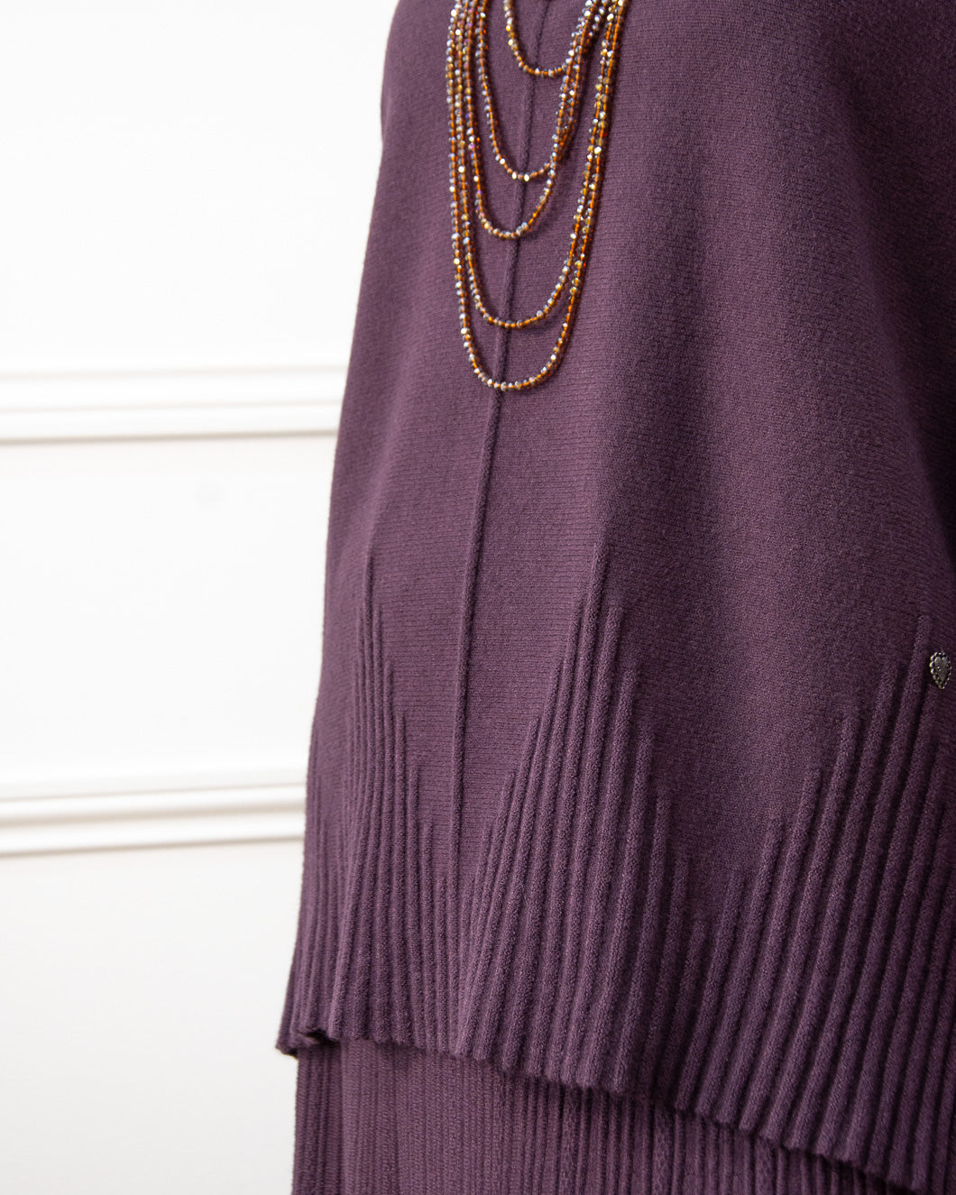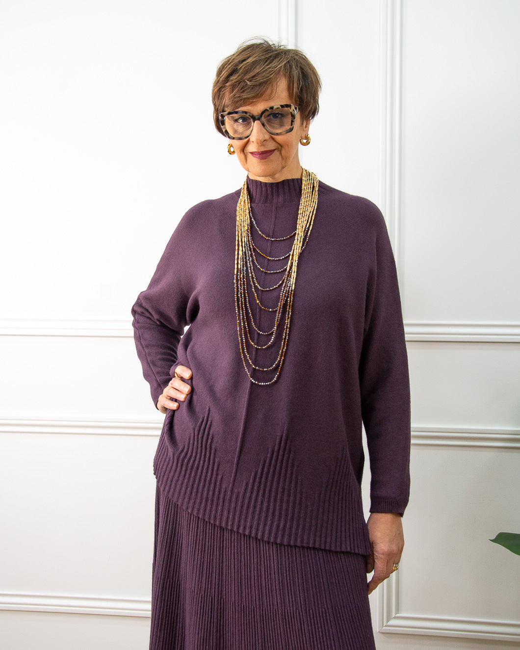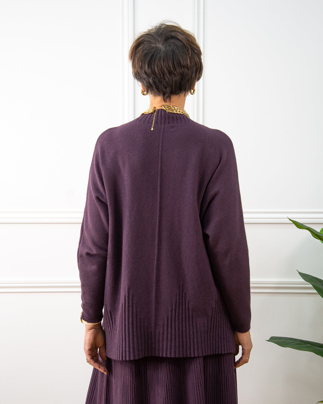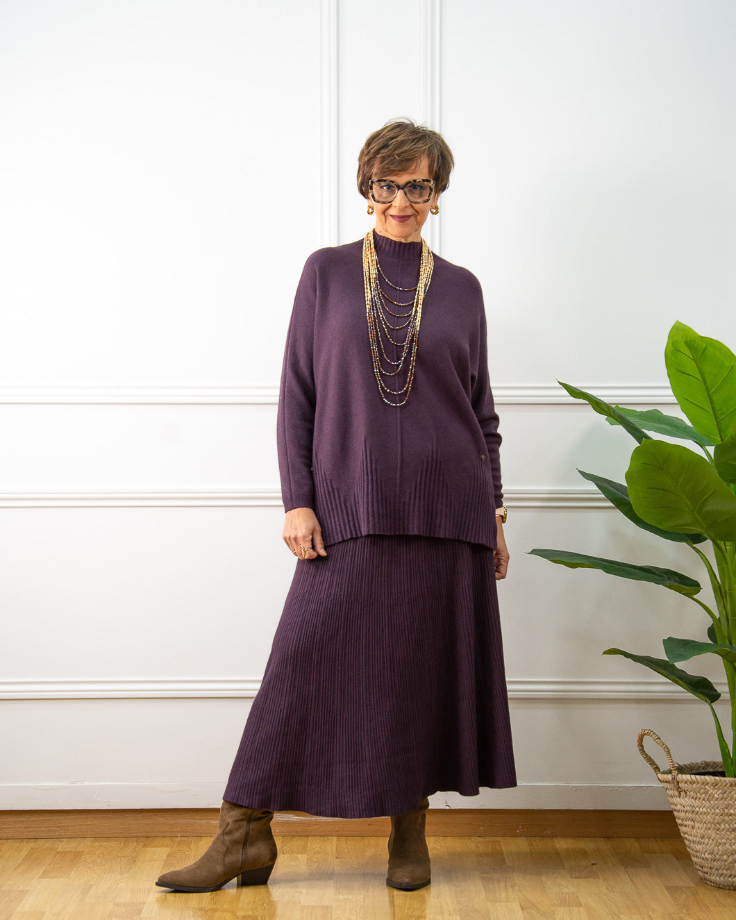 Jersey de cuello perkins, ultra suave, lleva un dibujo de triángulos al tono en la parte inferior por el delantero y la espalda, aberturas laterales de 12 cm. Ideal para combinar con la falda punto over.
