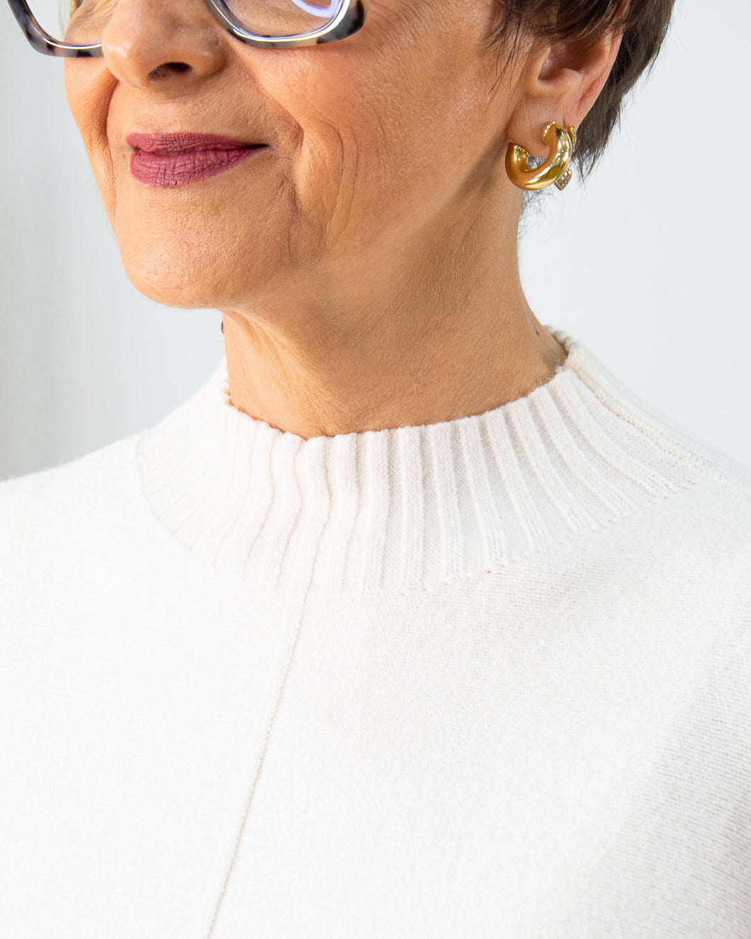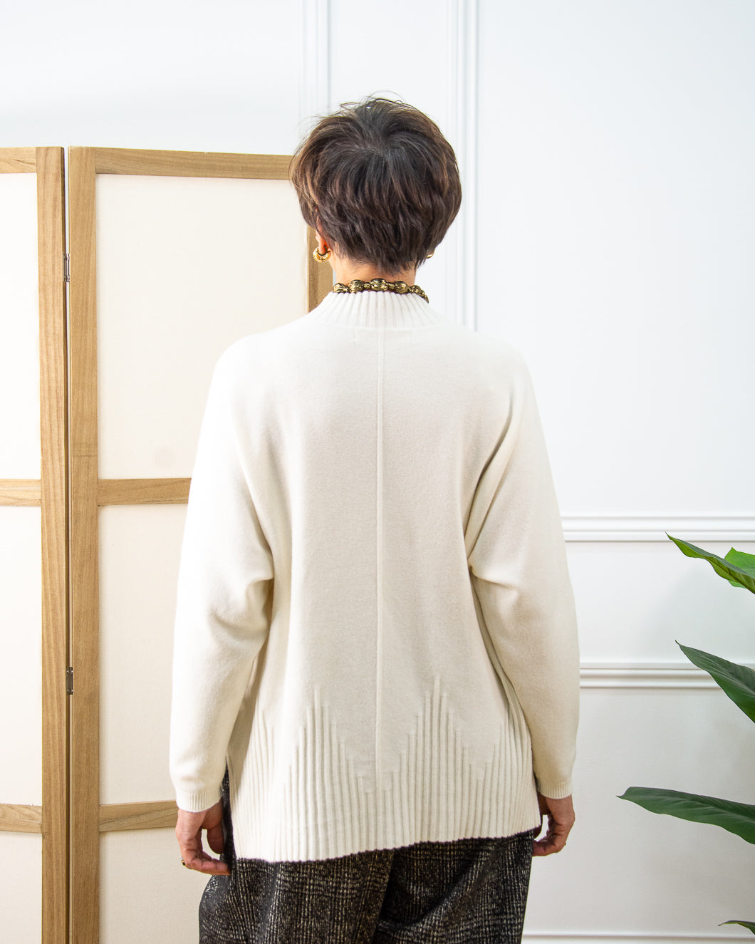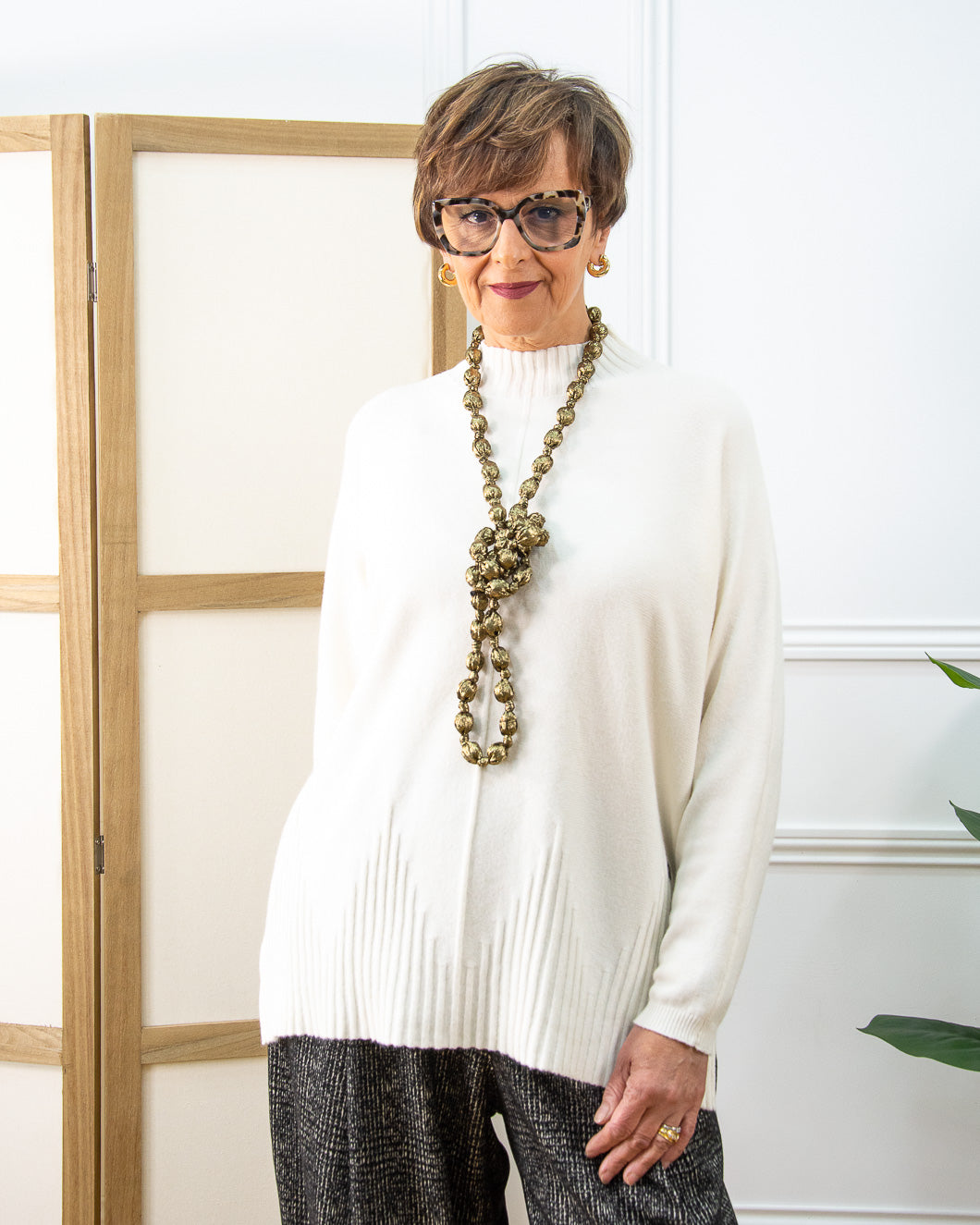 Jersey de cuello perkins, ultra suave, lleva un dibujo de triángulos al tono en la parte inferior por el delantero y la espalda, aberturas laterales de 12 cm. Ideal para combinar con la falda punto over.