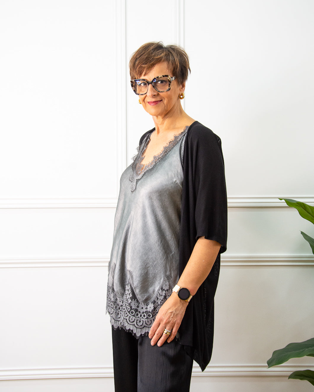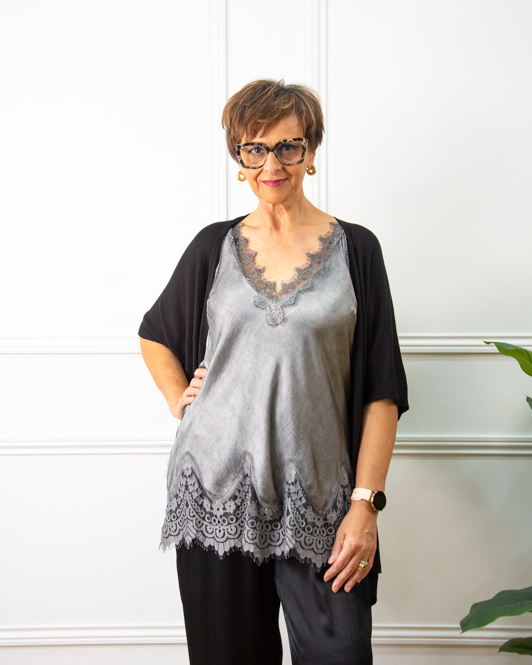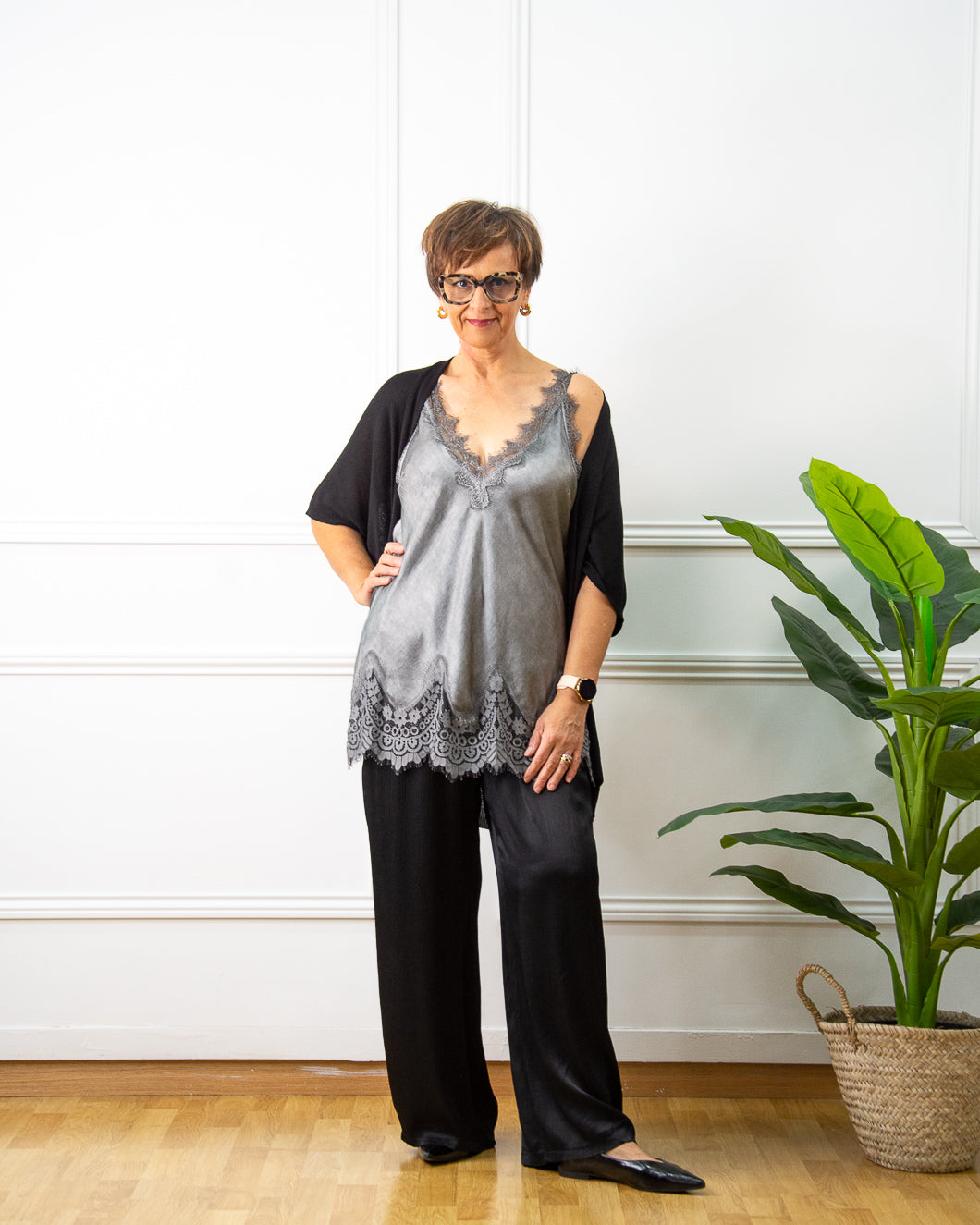 Lencera efecto lavado, va cortada al bies, por lo que el tejido abre bastante, ideal para combinar debajo de jerséis y enseñar la blonda.