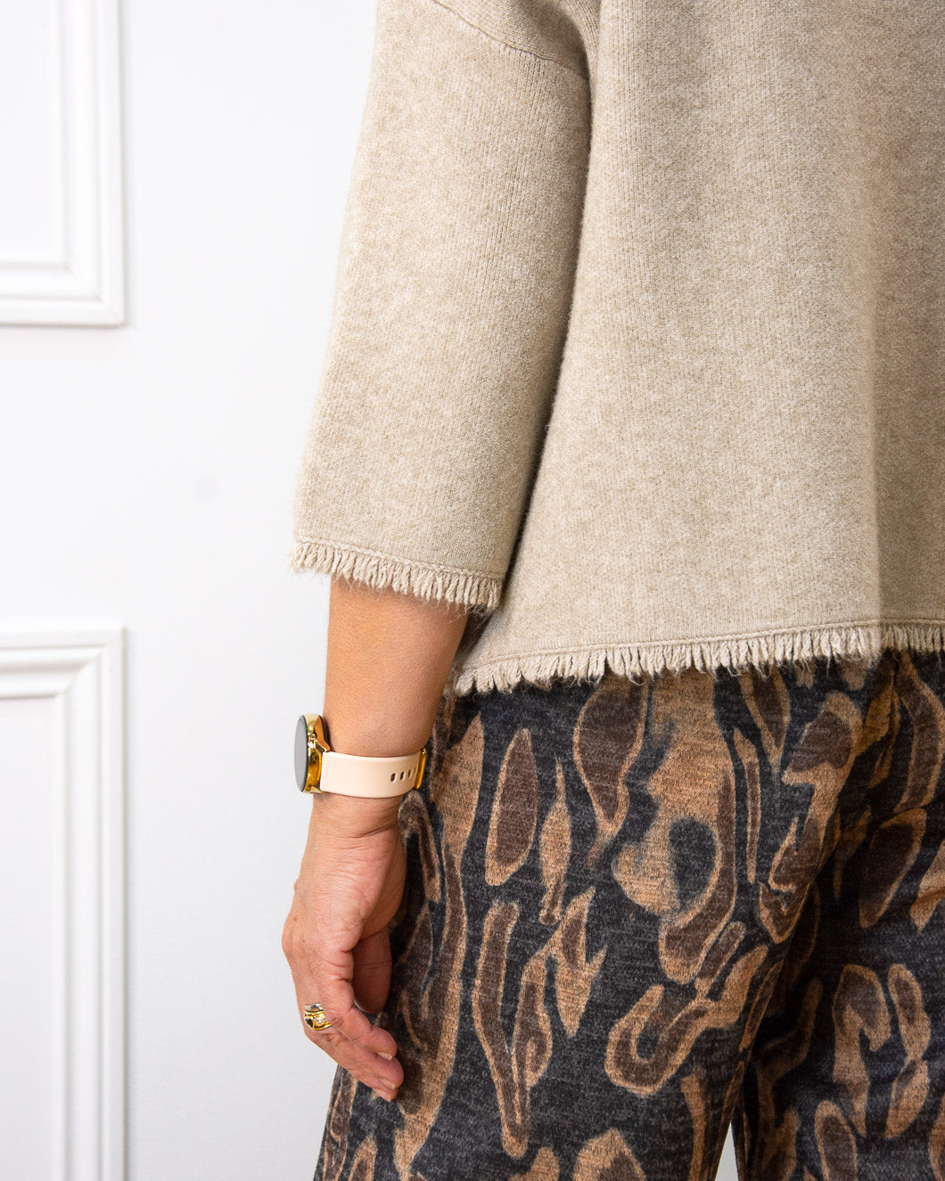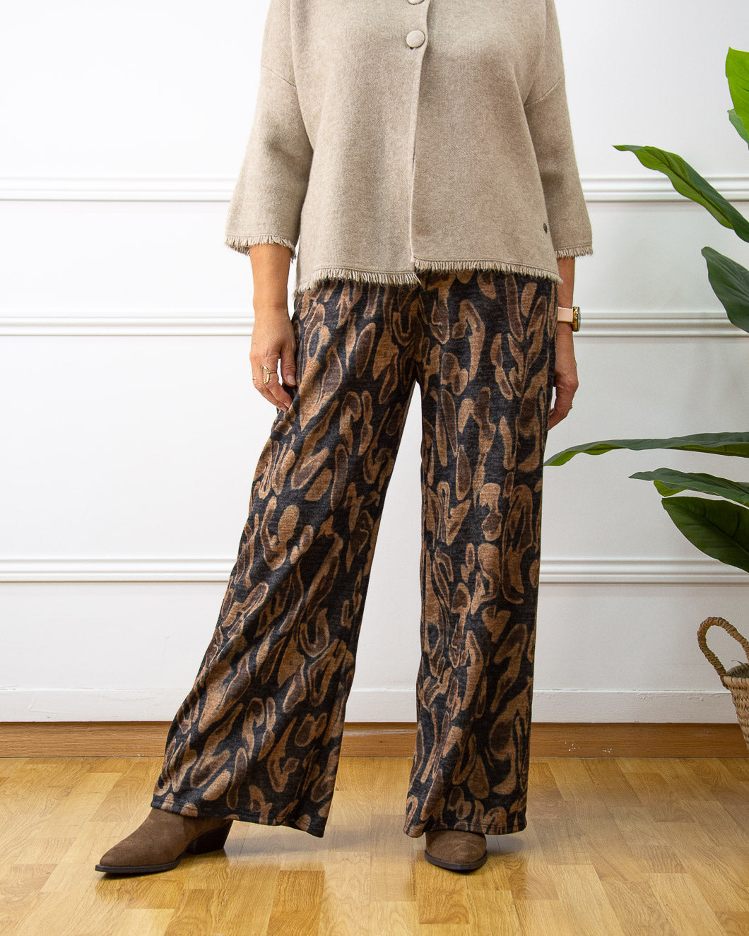 Talla única, medidas: contorno de cintura hasta 135cm con la goma estirada, contorno de cadera 140cm, largo 103cm, ancho de pata 70cm. Disponible en dos colores, negro y teja.