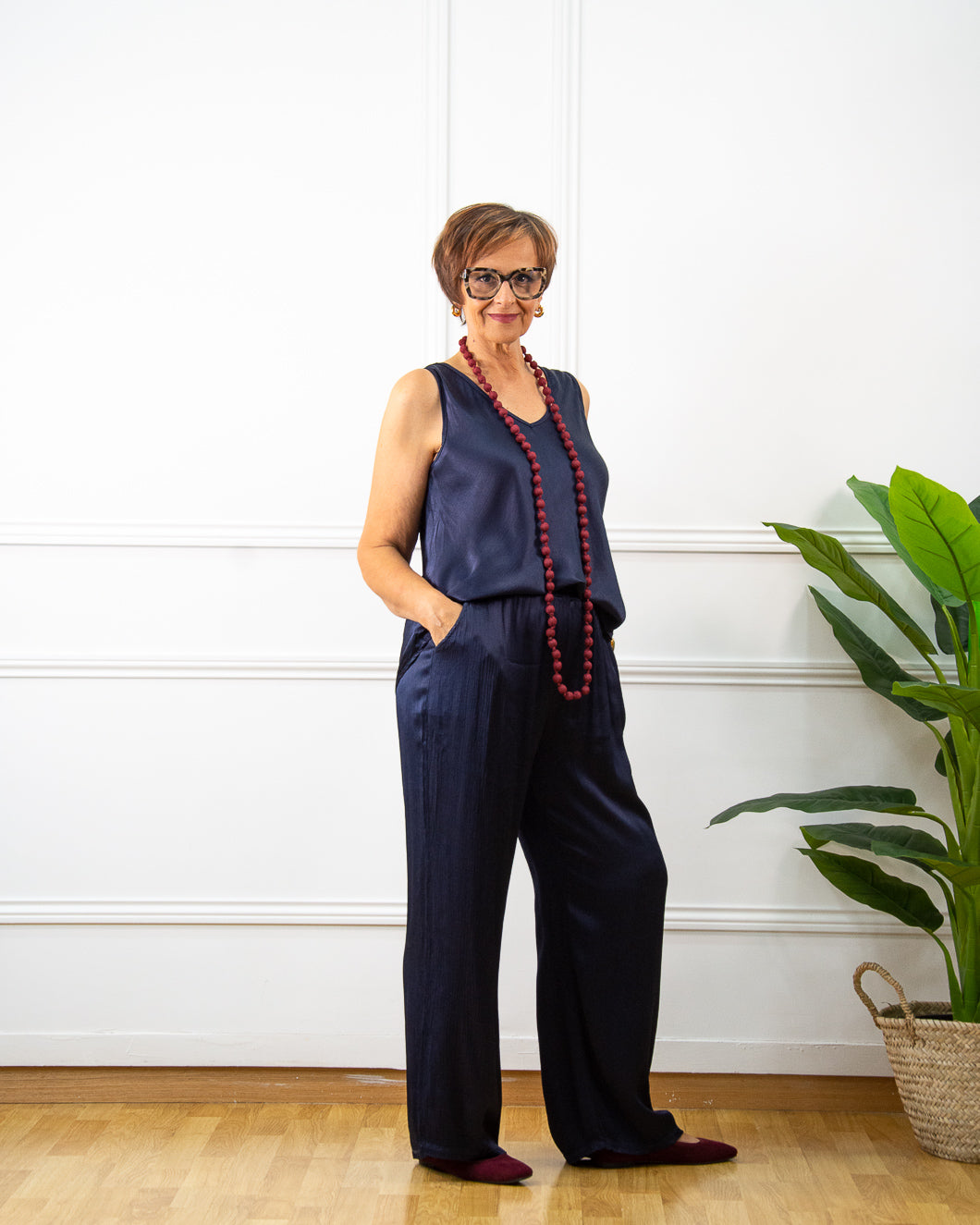 Pantalón de raso de bambula, lleva goma en la cinturilla y bolsillos laterales, pata ancha desde la cadera, tiene muchísima caída, ideal para llevarlo con la lencera Vera a juego.