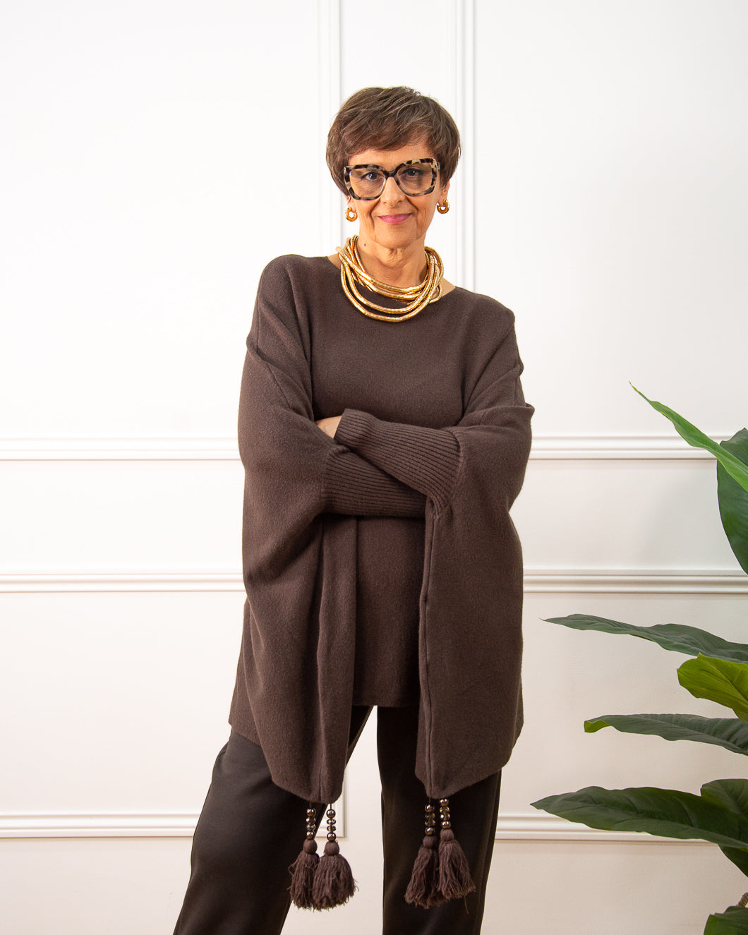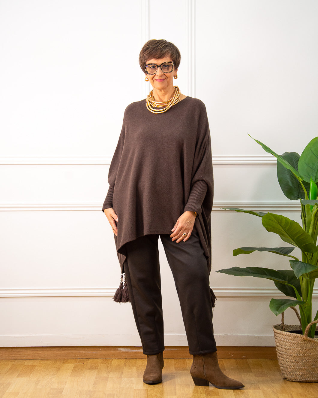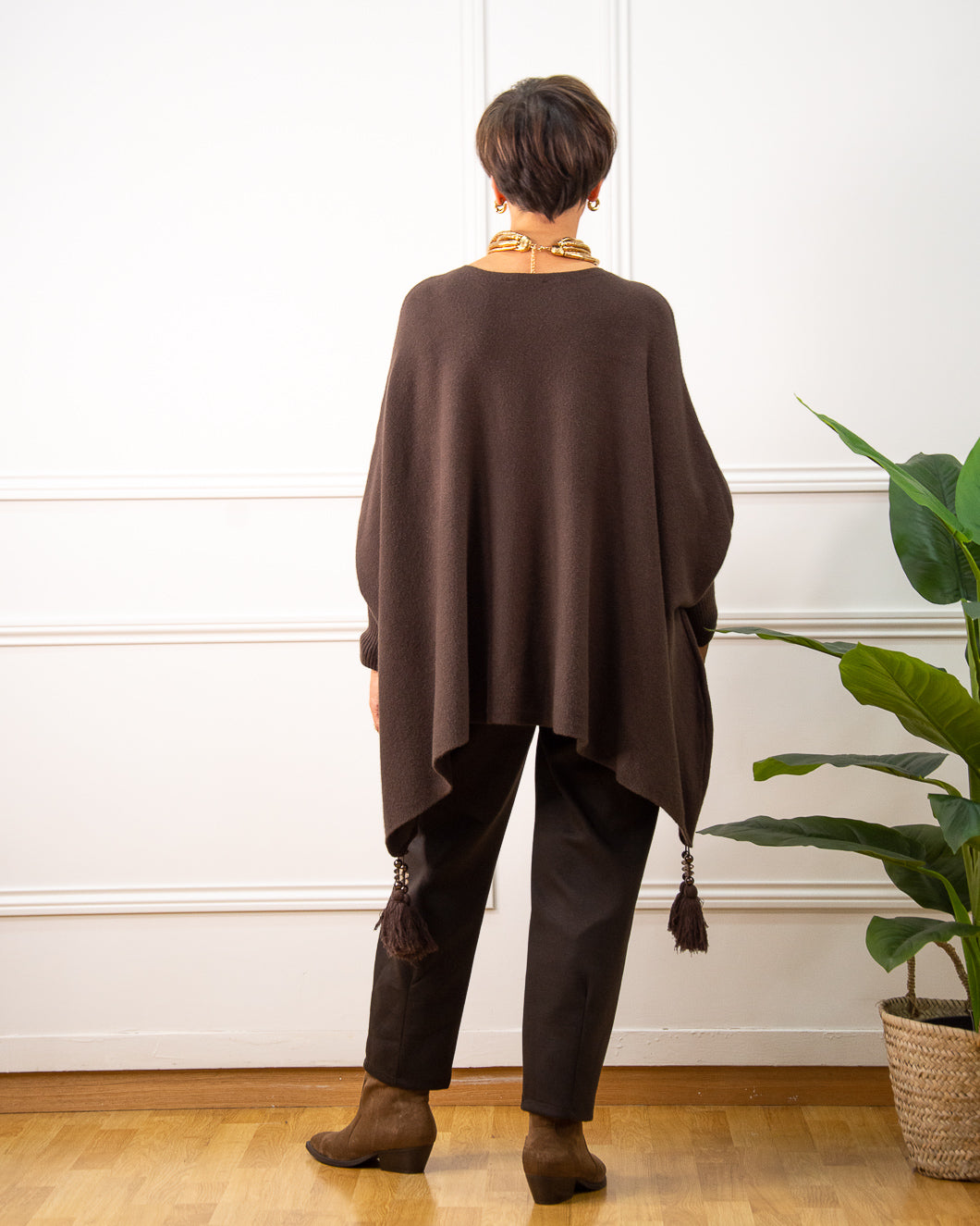 Poncho con mangas over size, el color rosa lleva bolsillos delanteros, los demás colores van lisos. El tacto es ultra suave, lleva cuatro borlones en cada esquina de la prenda.