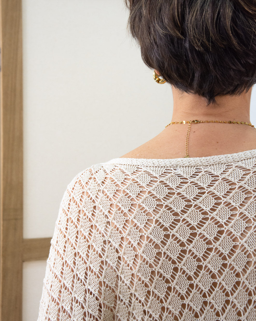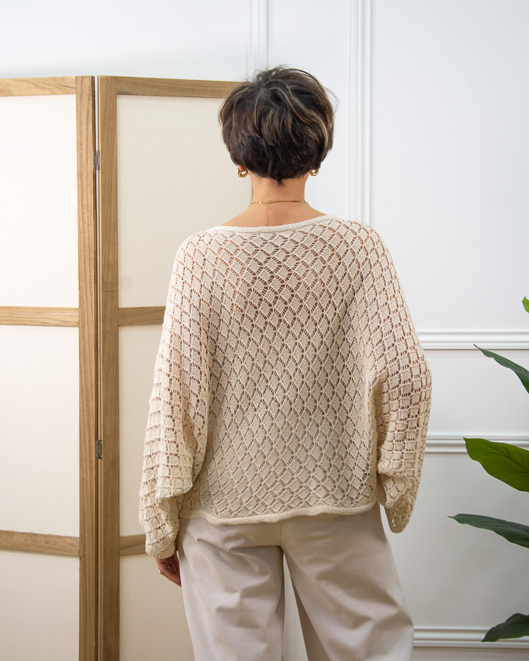 Poncho tipo ganchillo , lleva mangas y va cerrado, contraponiendo los delanteros de forma asimétrica. Ideal para llevar encima de vestidos de tirantes o con lencera debajo, súper versátil.