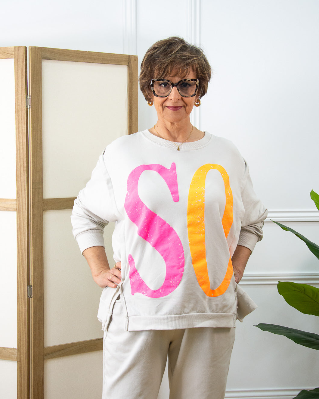 Sudadera de algodón over size, cuello redondo, lleva impreso dos letras en relieve flúor por delante y dos por la espalda con la palabra SOHO. Lleva dos aberturas por delante para meter por la cintura.Es ideal para combinar con el pantalón confort creando un total look súper cómodo y colorido.