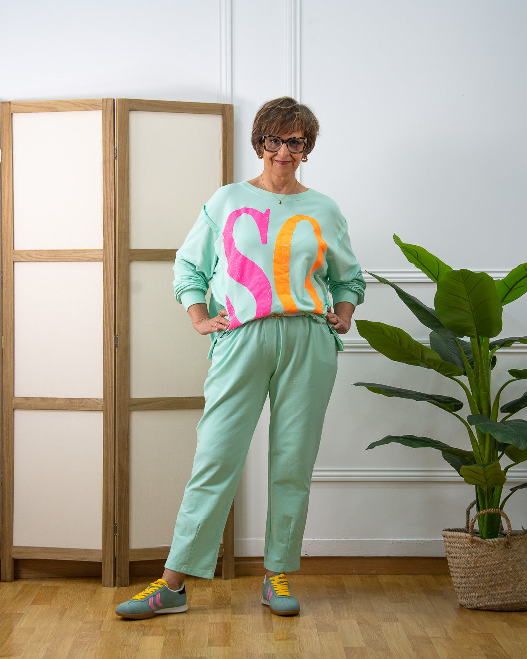 Sudadera de algodón over size, cuello redondo, lleva impreso dos letras en relieve flúor por delante y dos por la espalda con la palabra SOHO. Lleva dos aberturas por delante para meter por la cintura.Es ideal para combinar con el pantalón confort creando un total look súper cómodo y colorido.