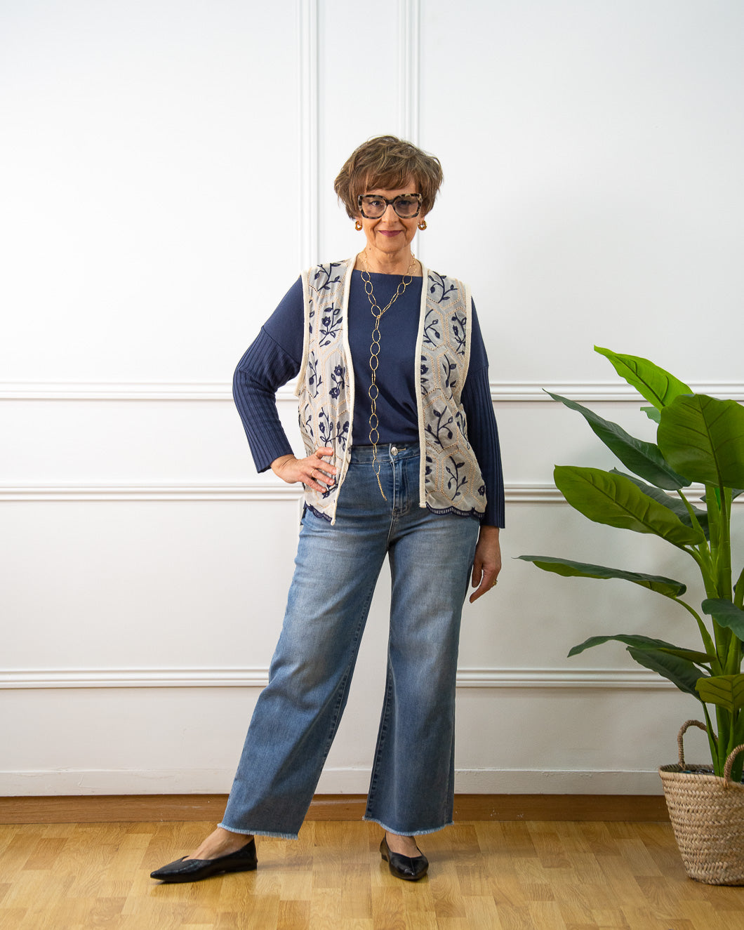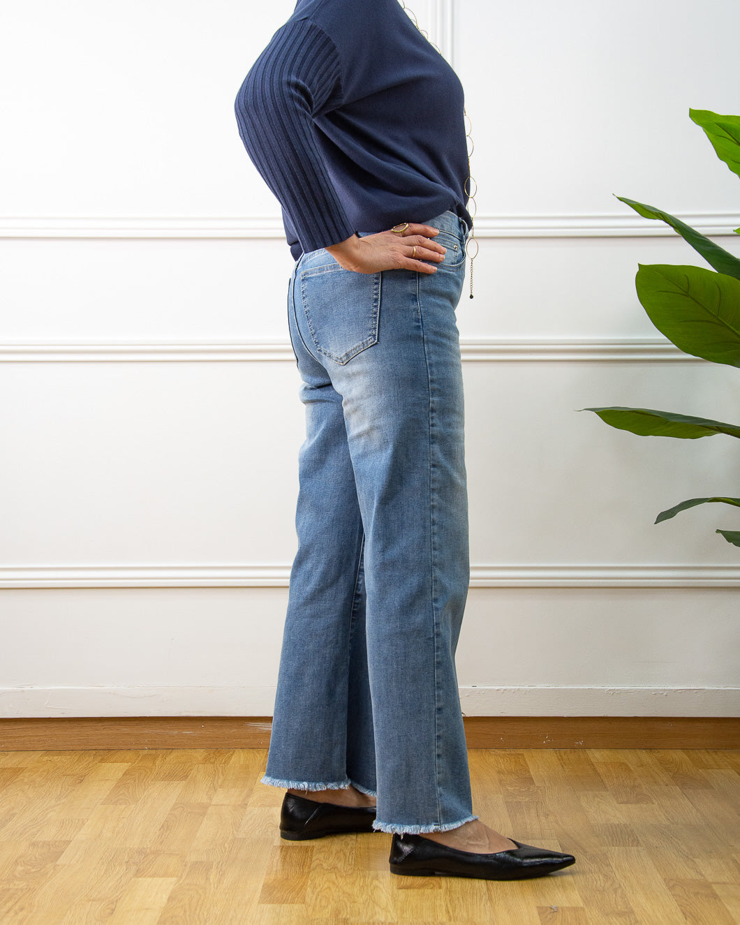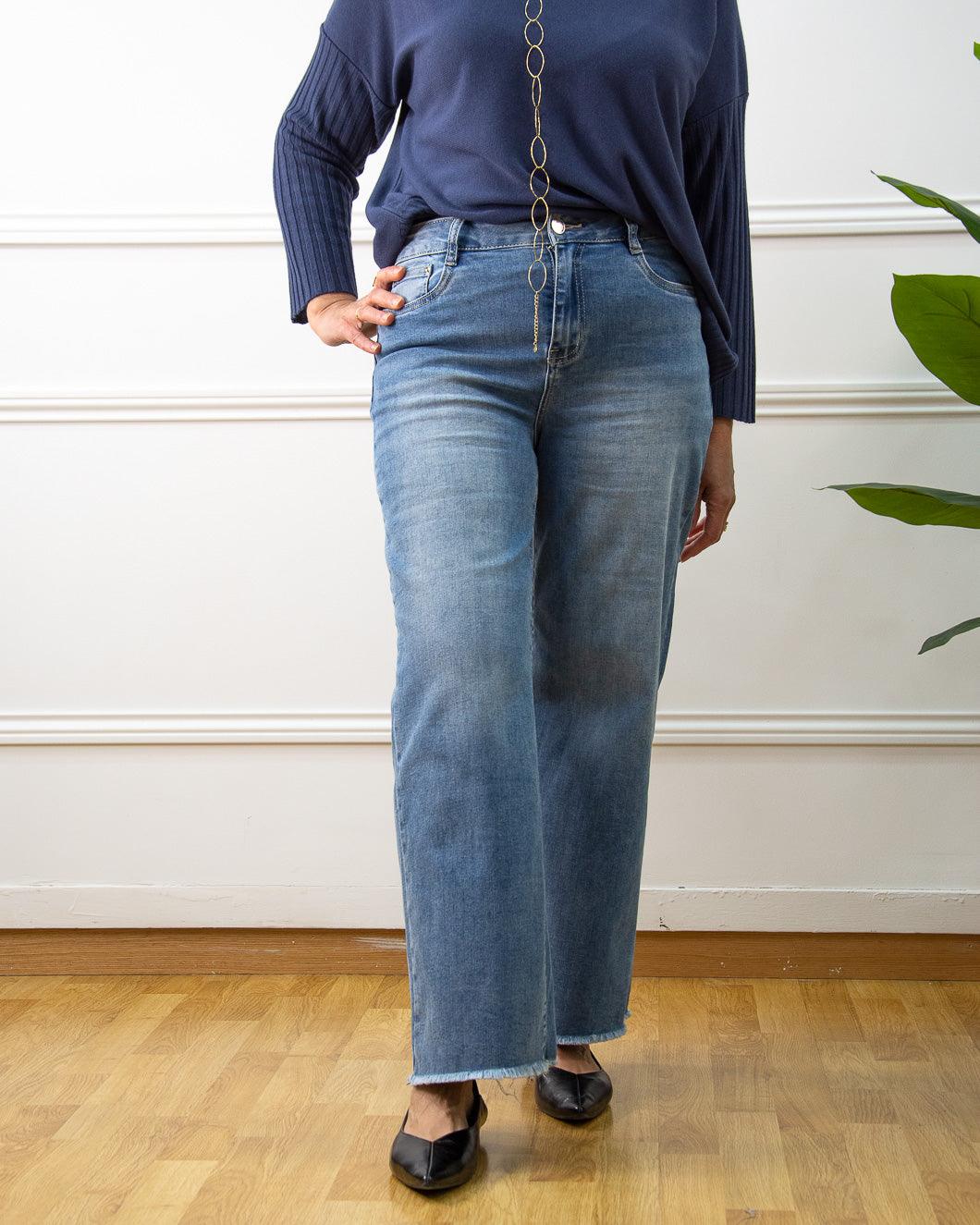 Vaquero de tiro alto, cinco bolsillos , pata ancha desde la cadera, lleva el bajo desflecado, muy cómodo para primavera.