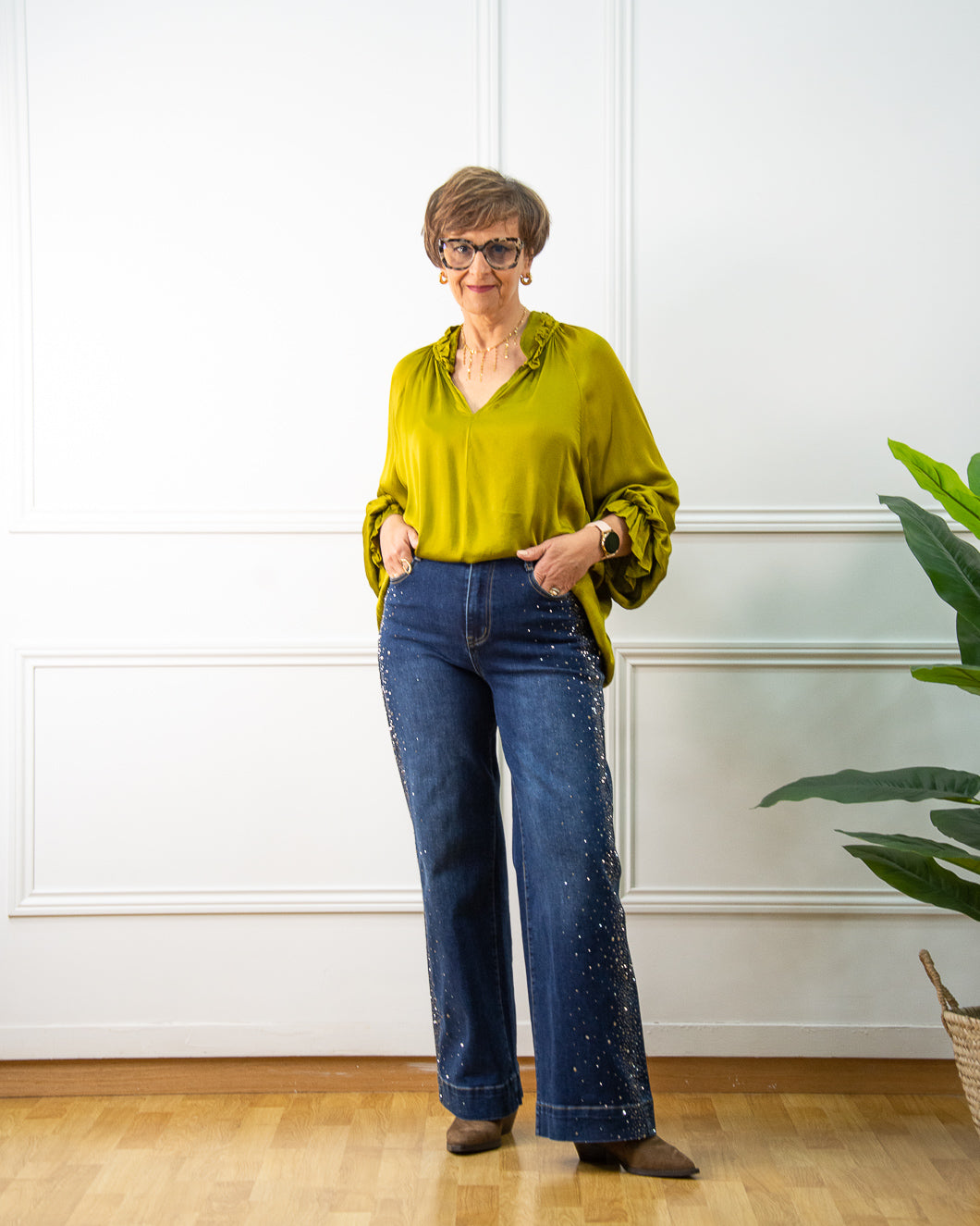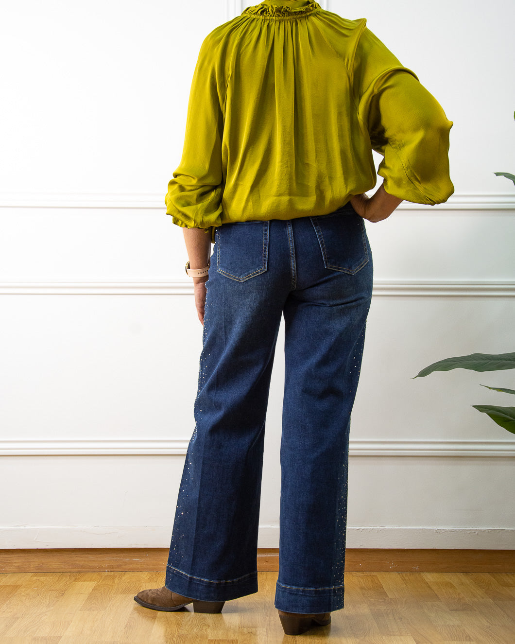 Pantalón vaquero de tiro alto, pata ancha desde la cadera, lleva strass termosellado en la parte lateral delantera, muy cómodo, recomendamos elegir una talla menos de la habitual.