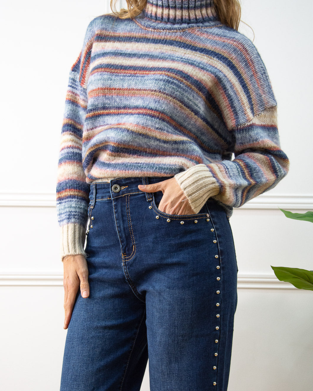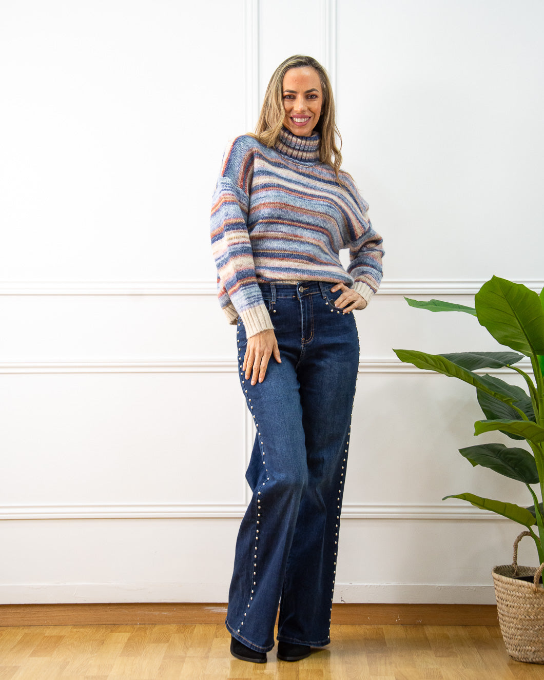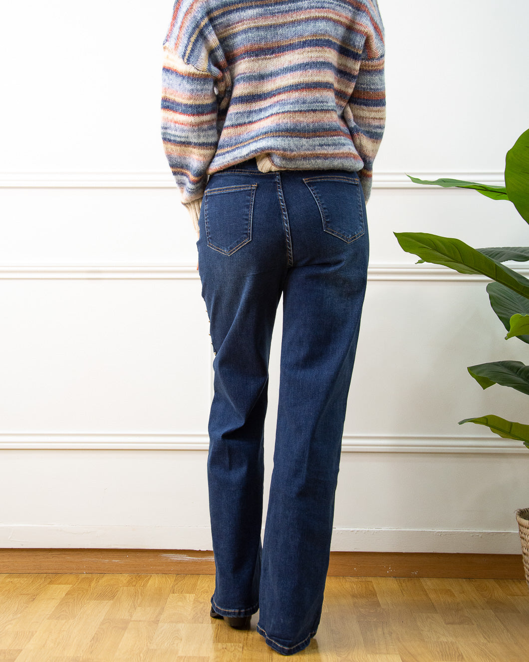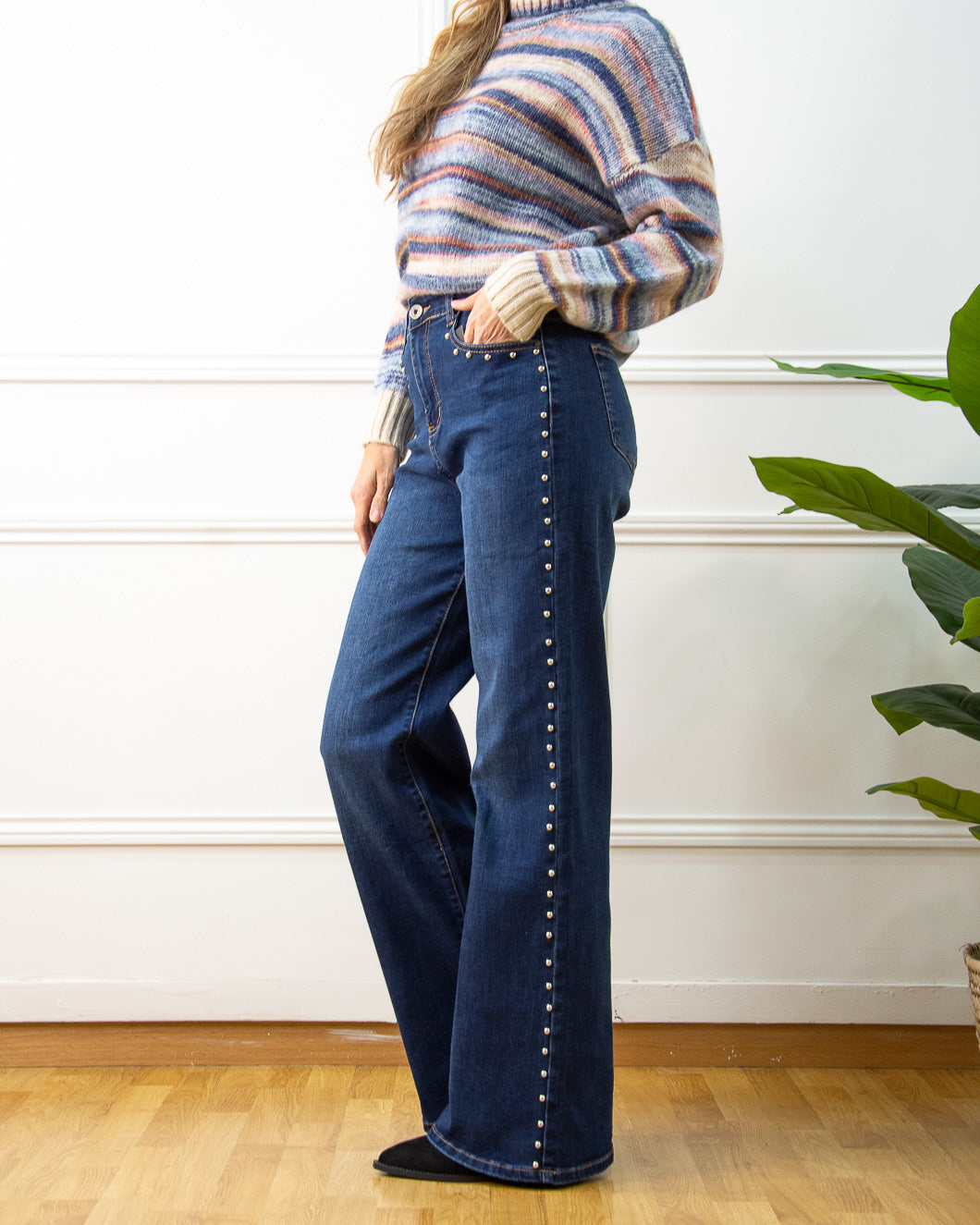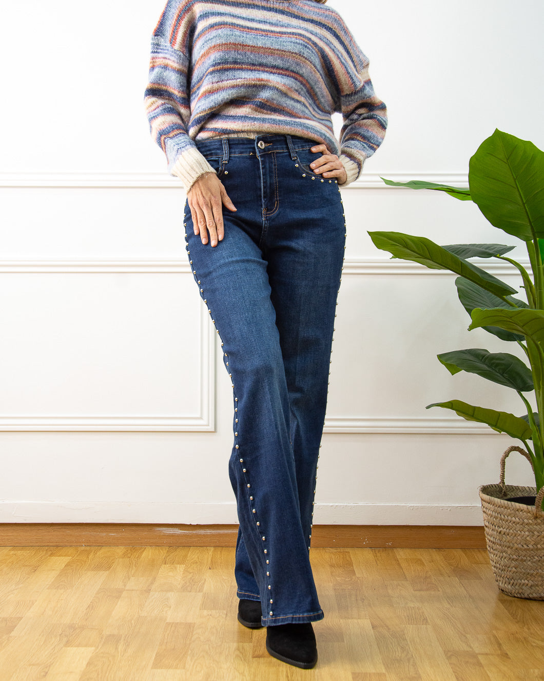 Pantalón vaquero de tiro alto, pata ancha desde la cadera, lleva strass termosellado en la parte lateral delantera, muy cómodo, recomendamos elegir una talla menos de la habitual.
